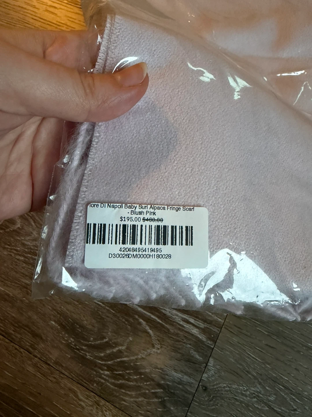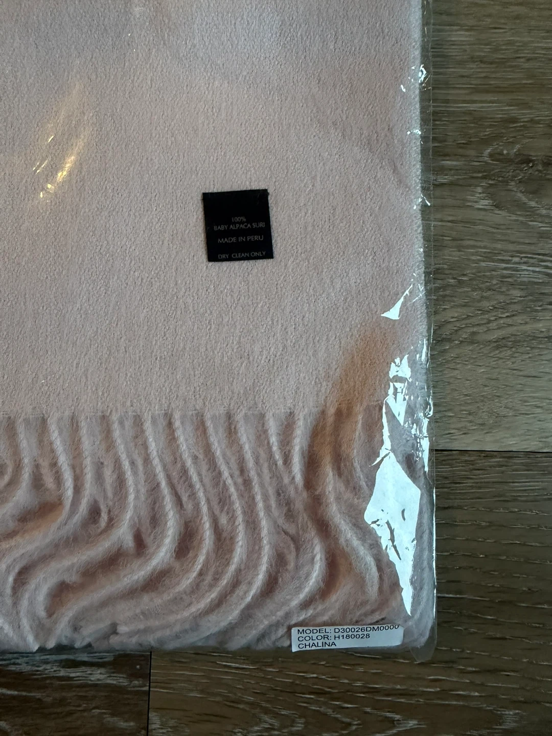 This Tore Di Napoli scarf is made of 100% baby suri alpaca. It's a blush pink color with fringe detailing. Made in Peru. Dry clean only. Original price was $190 on the discount already, selling for even a better price now :)