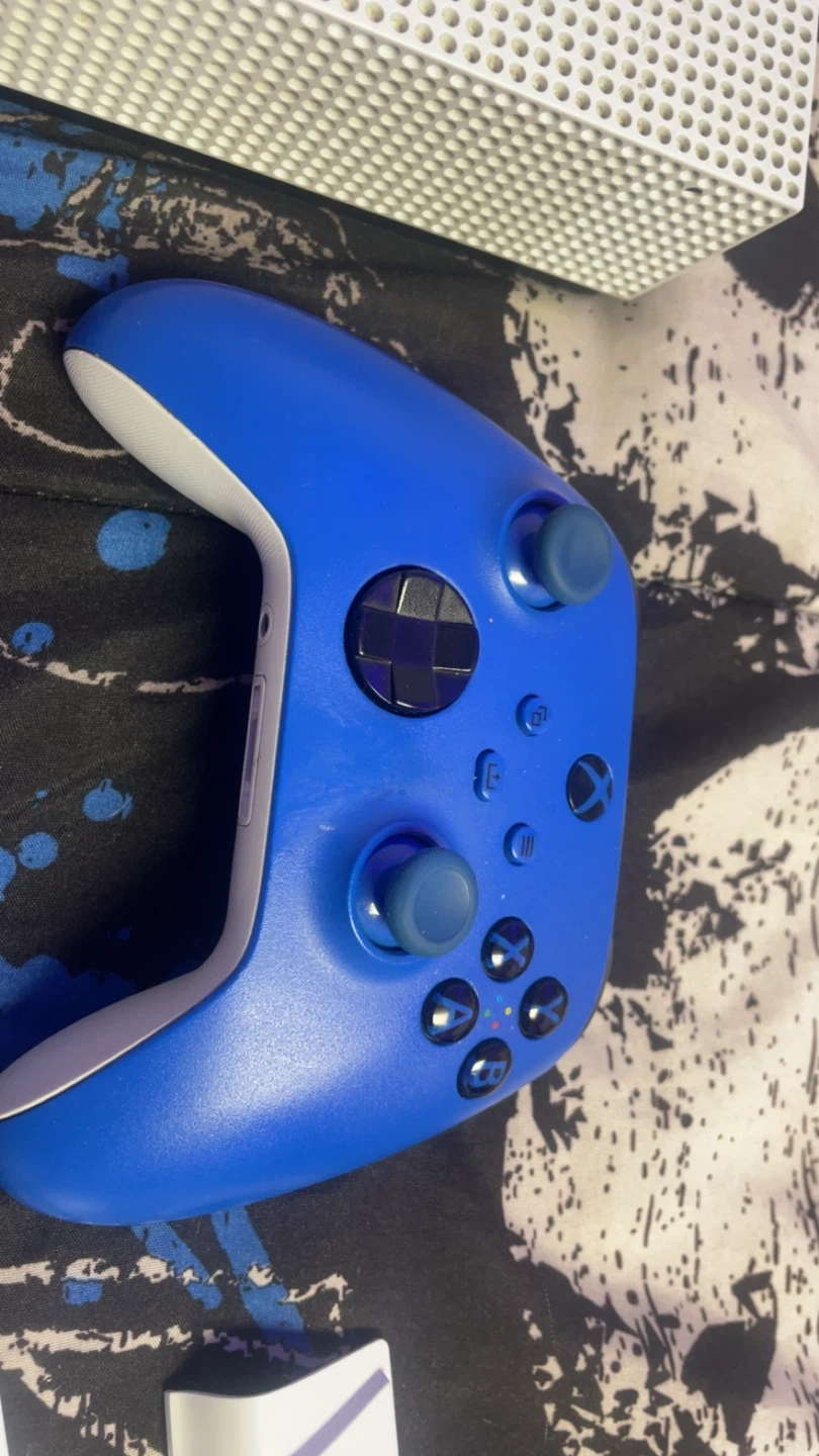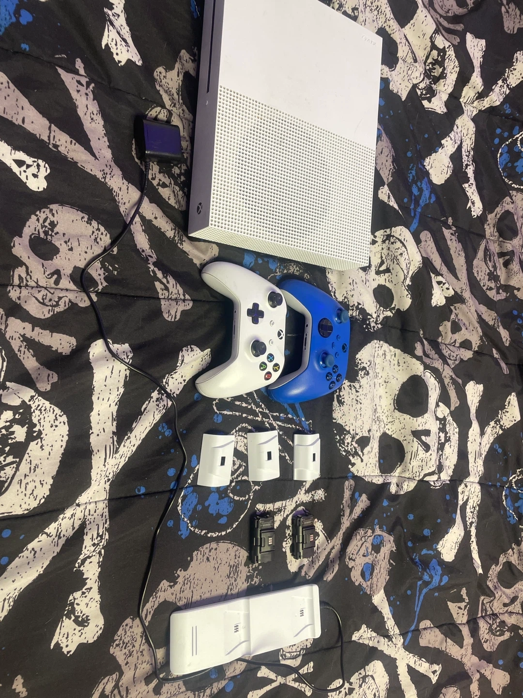 This is an Xbox One S console with two controllers, one blue and one white. It includes a charging dock with three battery covers and two batteries, It's a great setup for gaming! Honestly I just waned to sell these to get some money because I don’t use them much, they work pretty good to be honest. I will sell it as a bundles of sepretly.