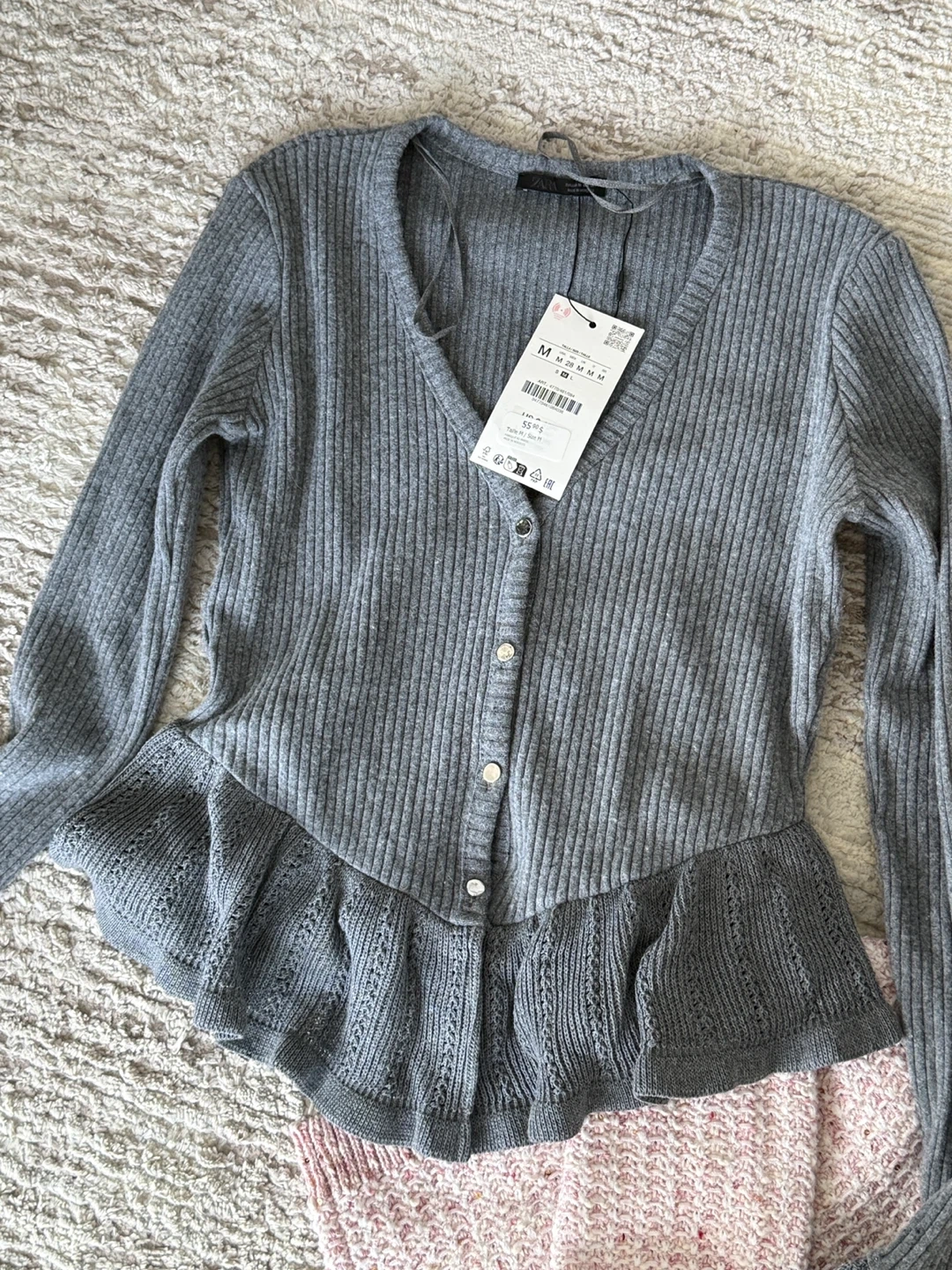 This Zara cardigan features a ribbed knit construction with a peplum hem. It has a V-neckline and a button-up front. The sleeves are long with a flared detail. This item is grey and size medium.