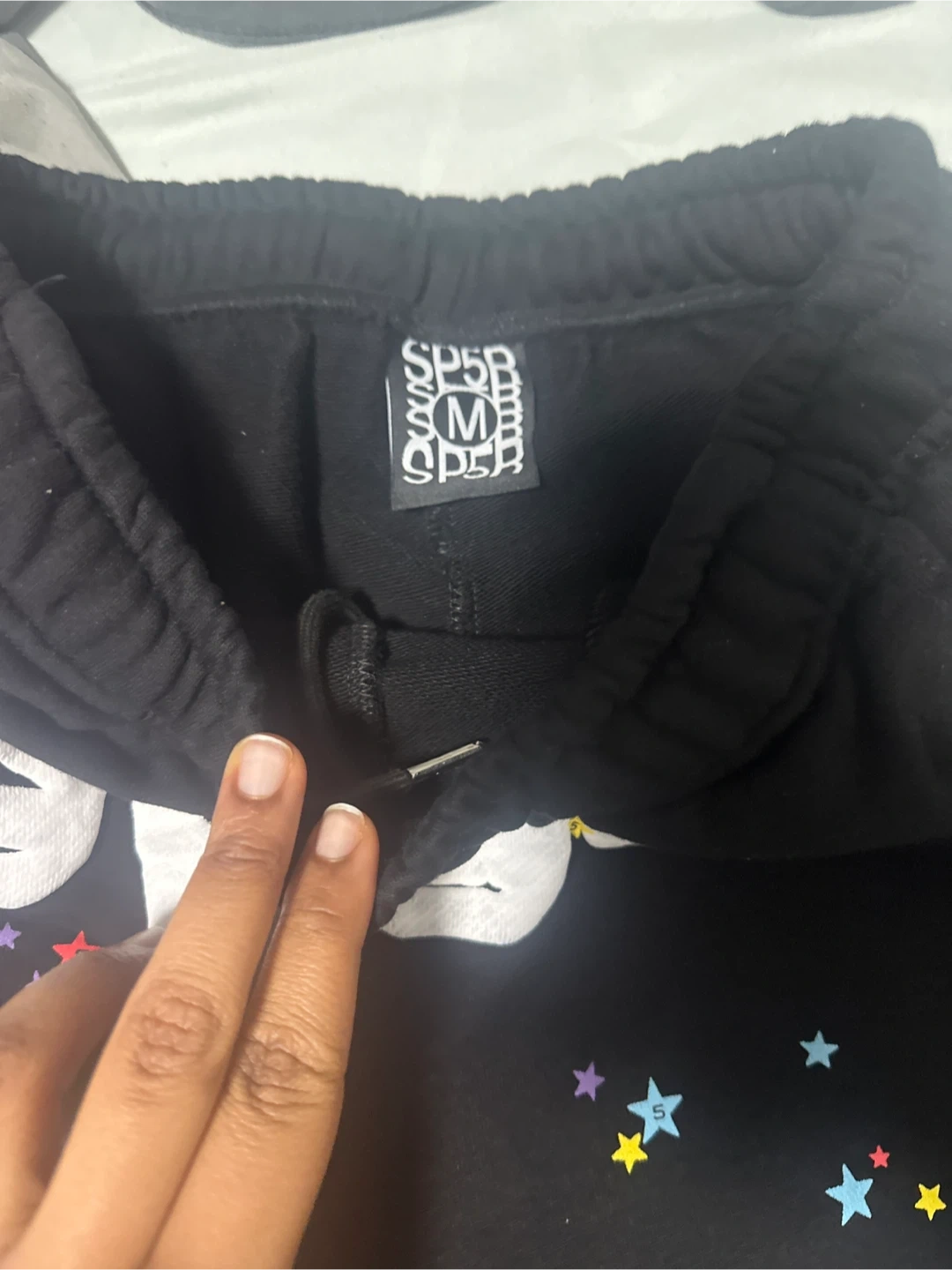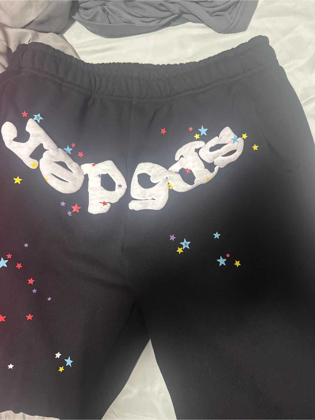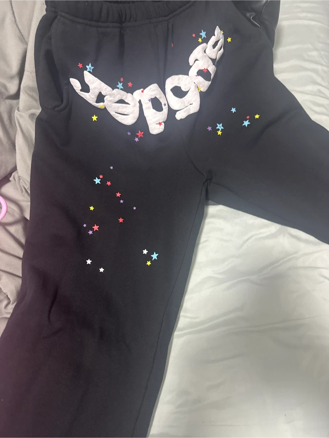 Selling a pair of SP5DER black sweatpants in size medium! They feature a unique design with colourful stars and the SP5DER logo. Great for casual wear!