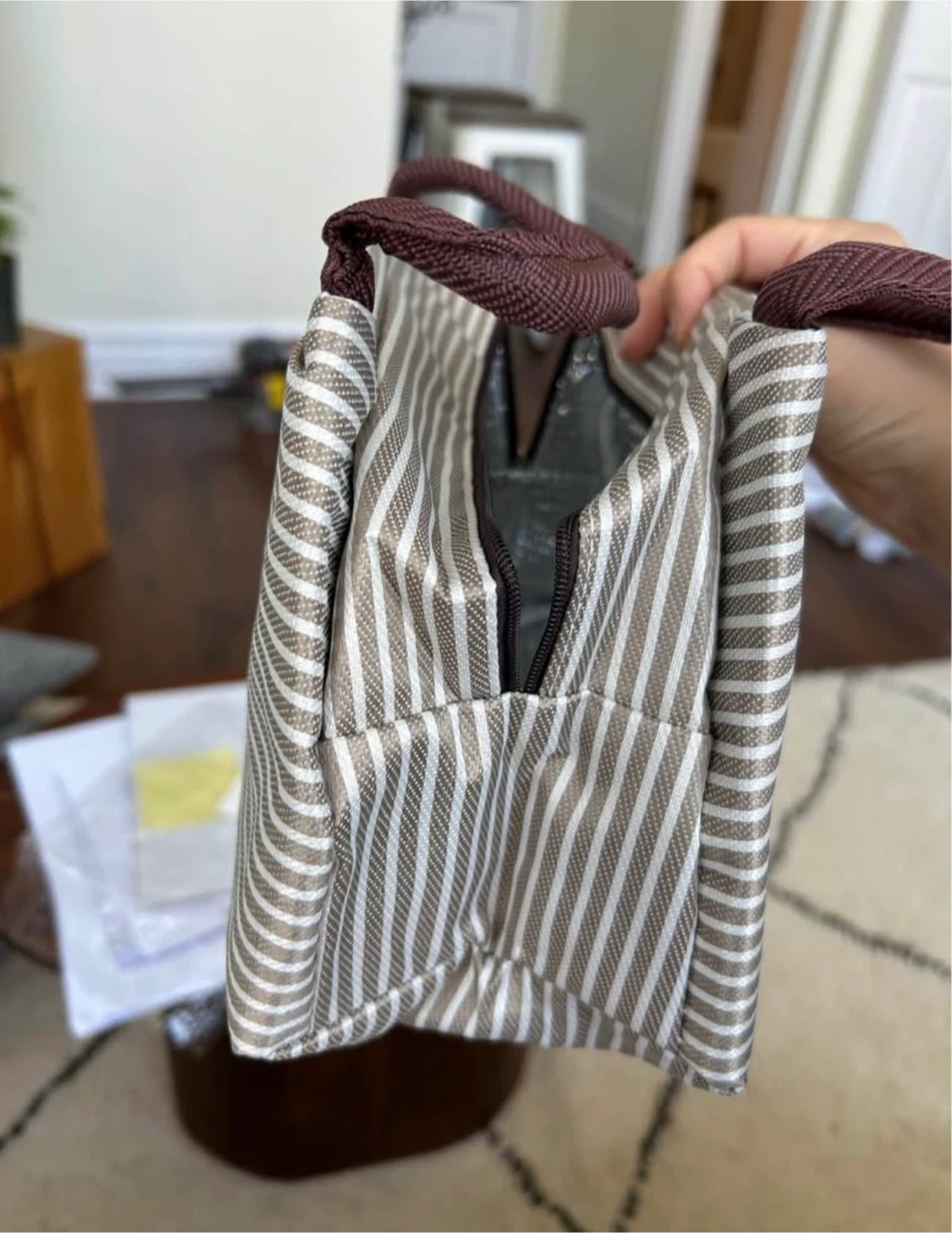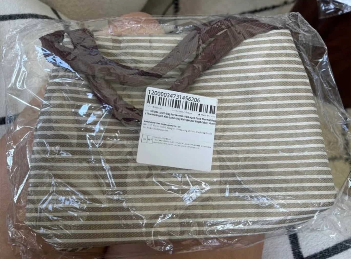Selling a brand new striped lunch bag! It's perfect for women, packaged thermal bag, or kids. It's a lunch pack refrigerator bag in colour khaki