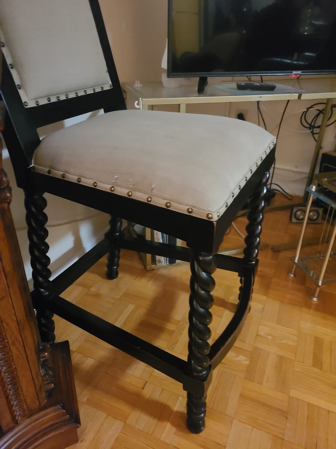 Selling a sturdy bar stool with a black frame and beige cushioned seat and back. It features unique twisted legs and a classic design. It's perfect for adding a touch of elegance to your kitchen or bar area!