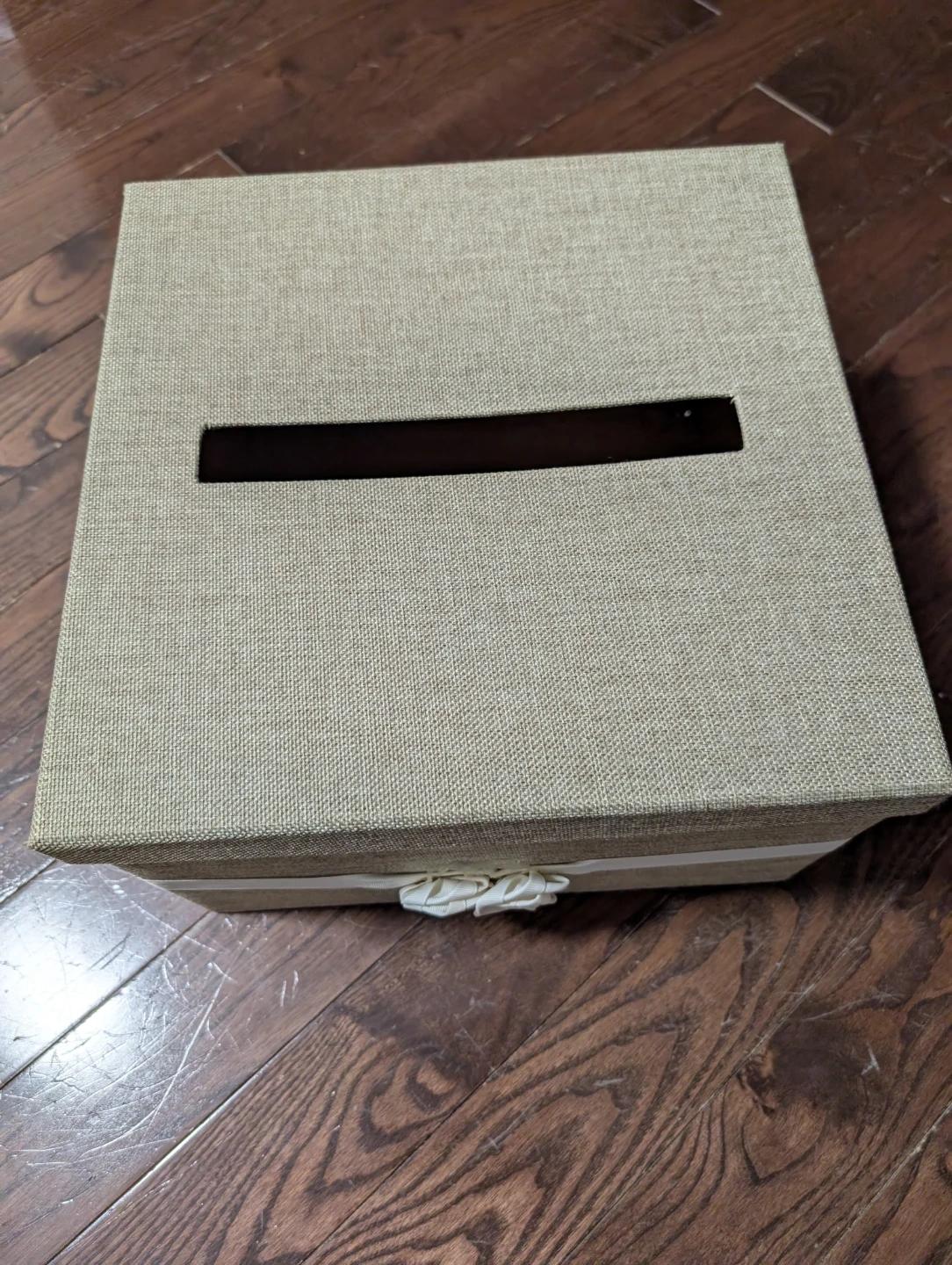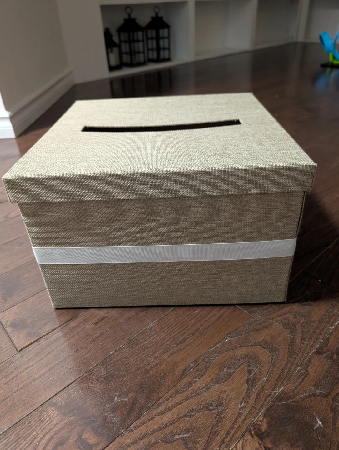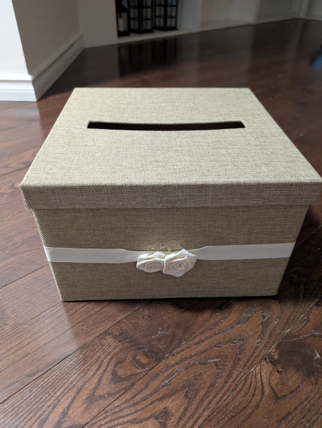 This decorative card box is covered in a natural-toned linen-like fabric. It features a slot on top for cards and is adorned with a white ribbon and two fabric rosettes. It's perfect for collecting cards at events like weddings or parties!