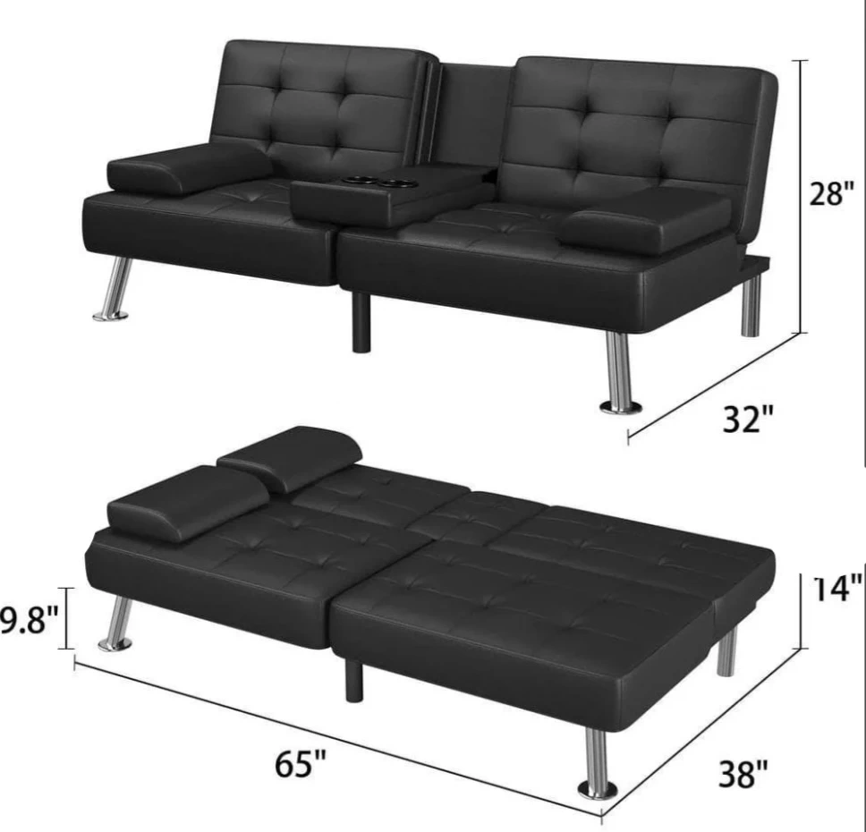 This versatile futon sofa easily converts into a bed. It's upholstered in black faux leather and features a centre console with cup holders. The sofa bed dimensions are 65" L x 38" W x 14" H when unfolded.