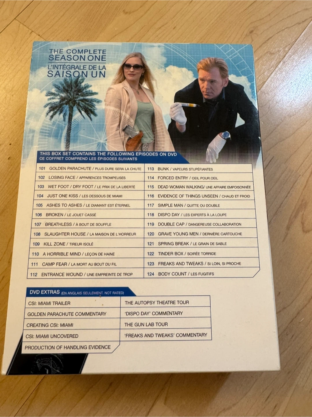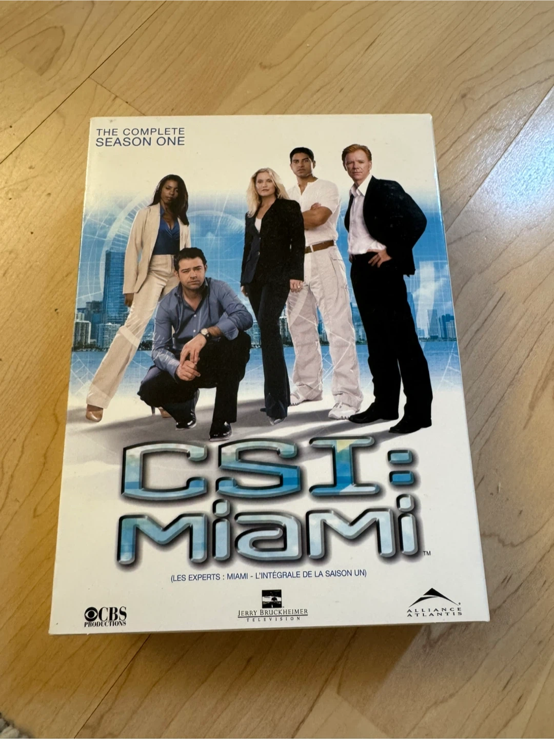 This DVD box set includes CSI: Miami, The Complete Season One. It features all episodes from the first season, plus DVD extras. All discs are included.