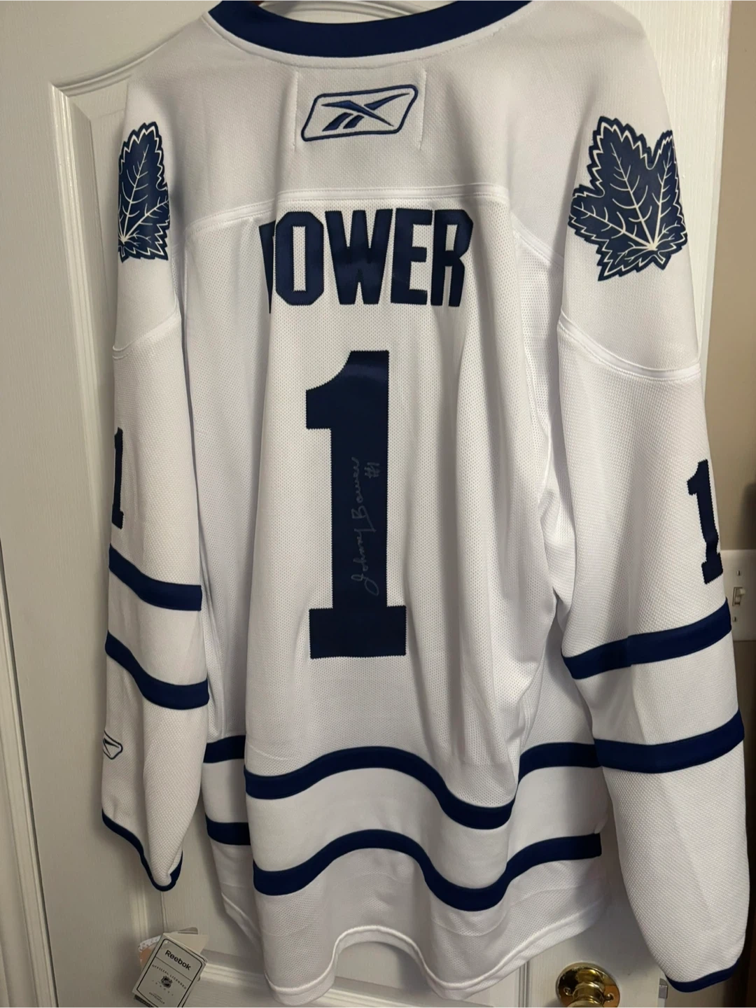 This is a white Reebok Toronto Maple Leafs hockey jersey with "POWER" and the number "1" on the back. It features maple leaf logos on the shoulders. The jersey is signed by Johnny Bower! Material is polyester.