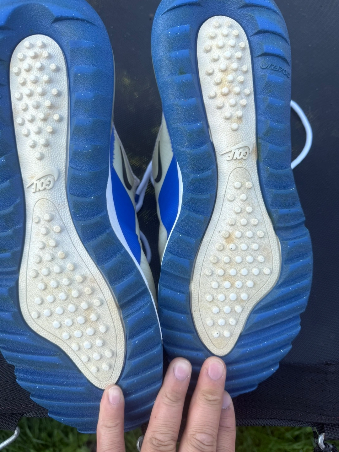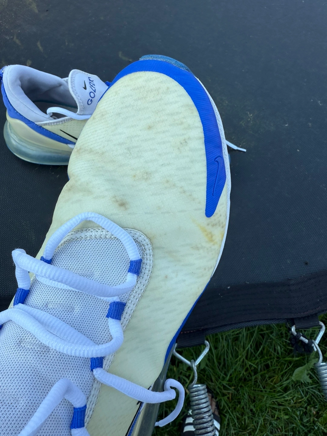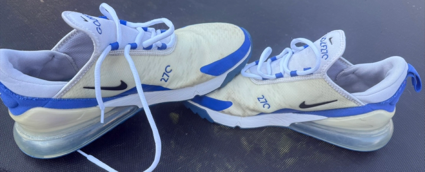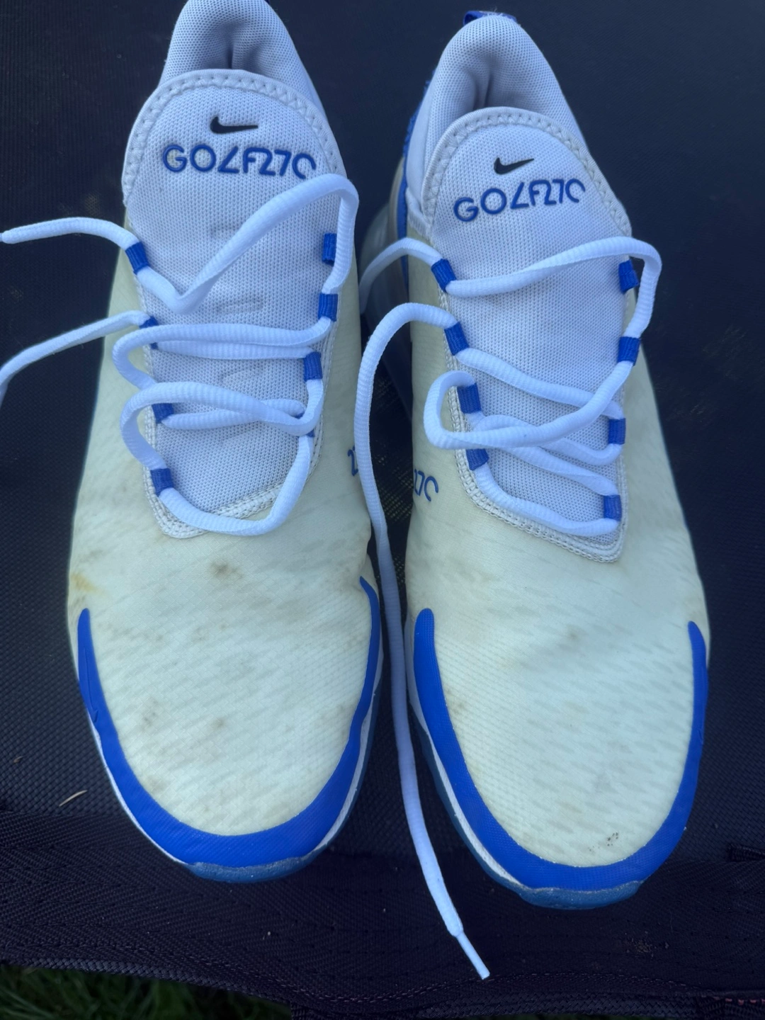 Selling a pair of Nike Air Max 270 golf shoes in a white and blue colourway. They show signs of wear, as you can see in the photos. Great for the golf course!