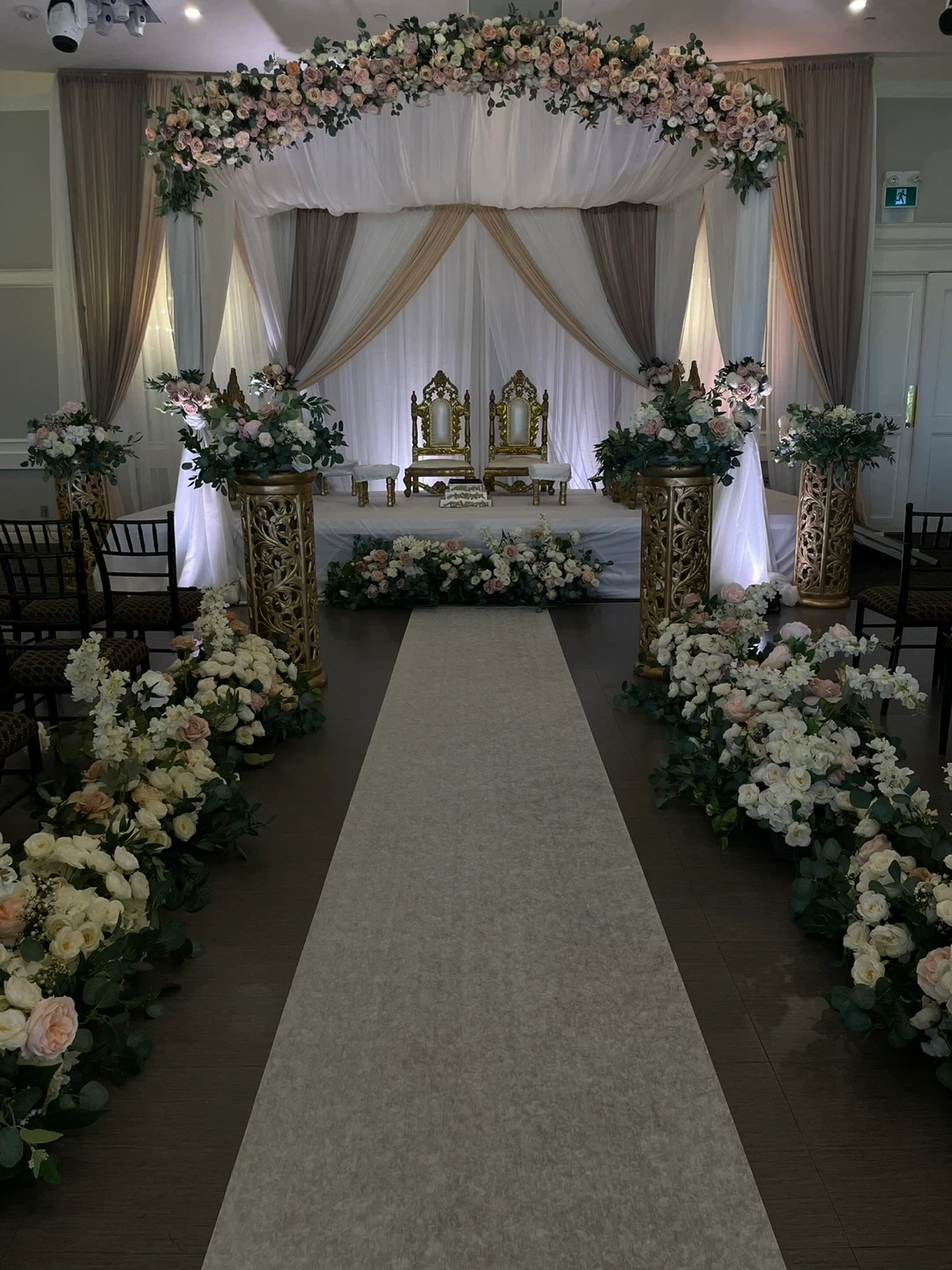 A collection of colourful hanging lanterns and elegantly set outdoor tables are perfect for creating a festive atmosphere. The second image shows a formal indoor event setup with floral arrangements and seating. These would be great for events and gatherings!