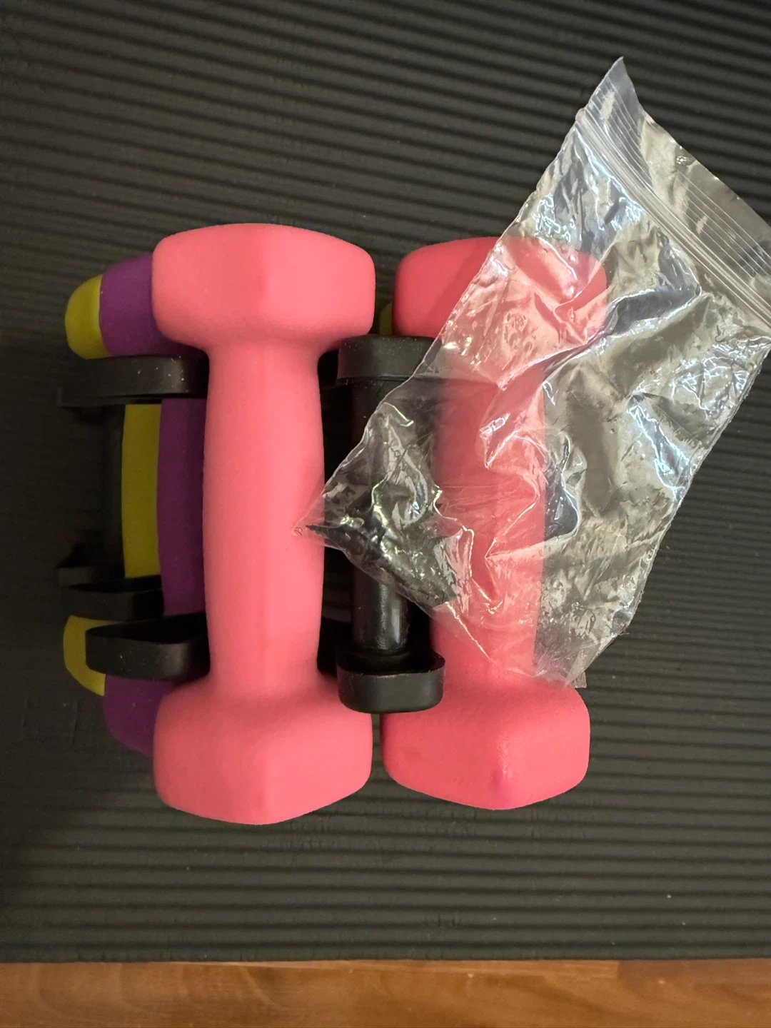 This set includes pairs of 2lb, 3lb, and 5lb dumbbells in pink, purple, and yellow. They have a comfortable grip and come with a handy rack for storage. Weights are clearly marked for easy identification.