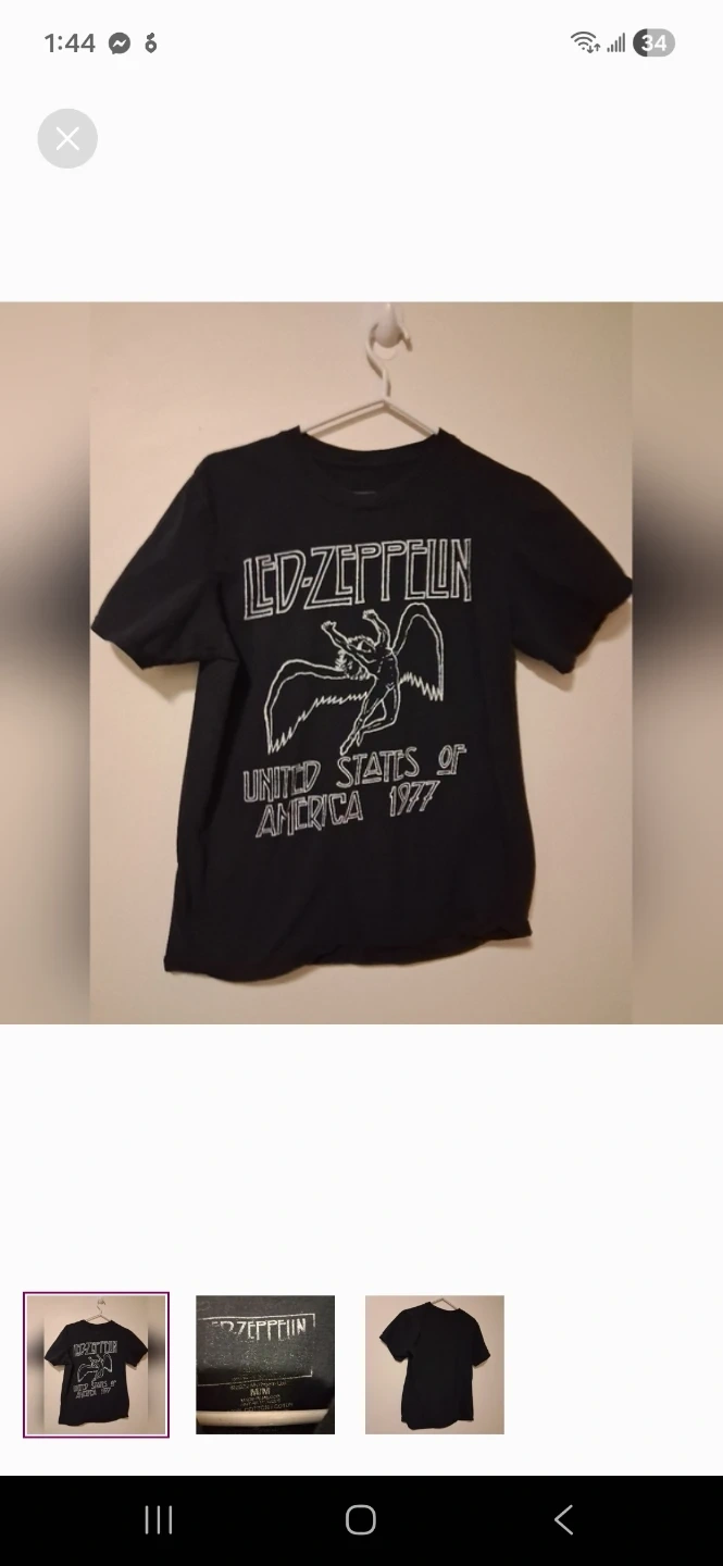 This black t-shirt features the Led Zeppelin logo and a graphic of a winged figure with "United States of America 1977" text. It's a size M/M. 100% cotton.