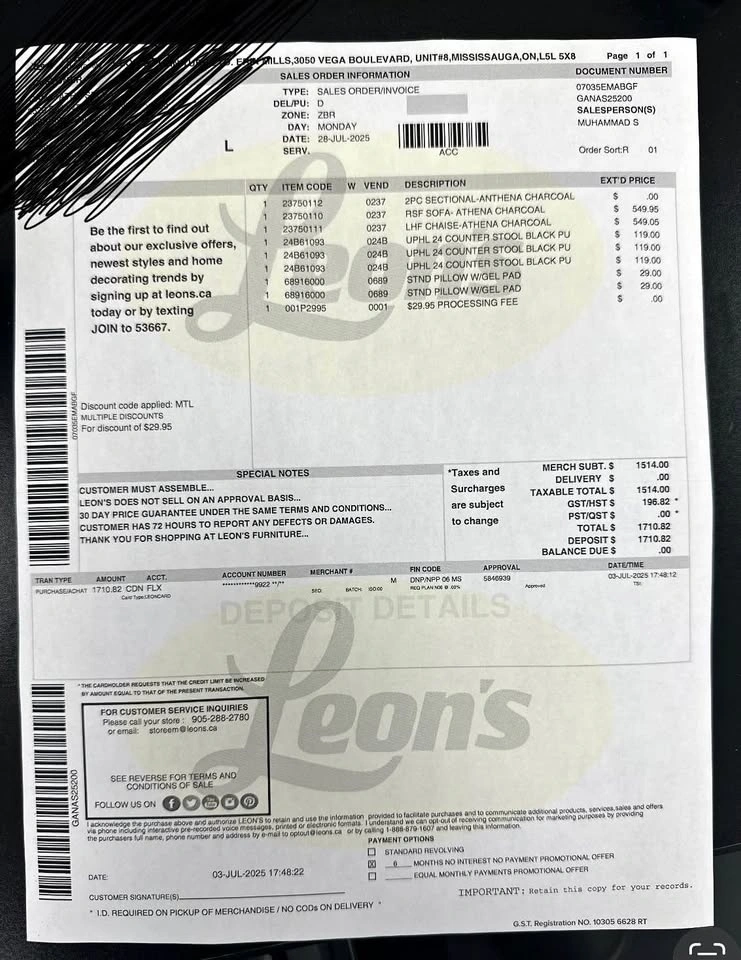 A sectional sofa set purchased at Leon’s in August 2025. It comfortably seats 4-5 people. Originally purchased for approximately $1100 CAD including tax.