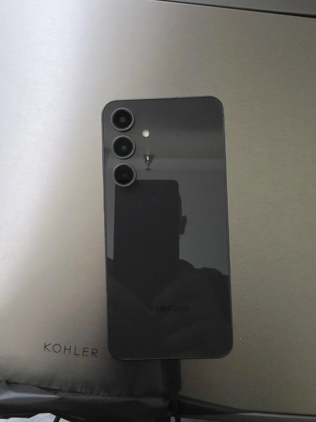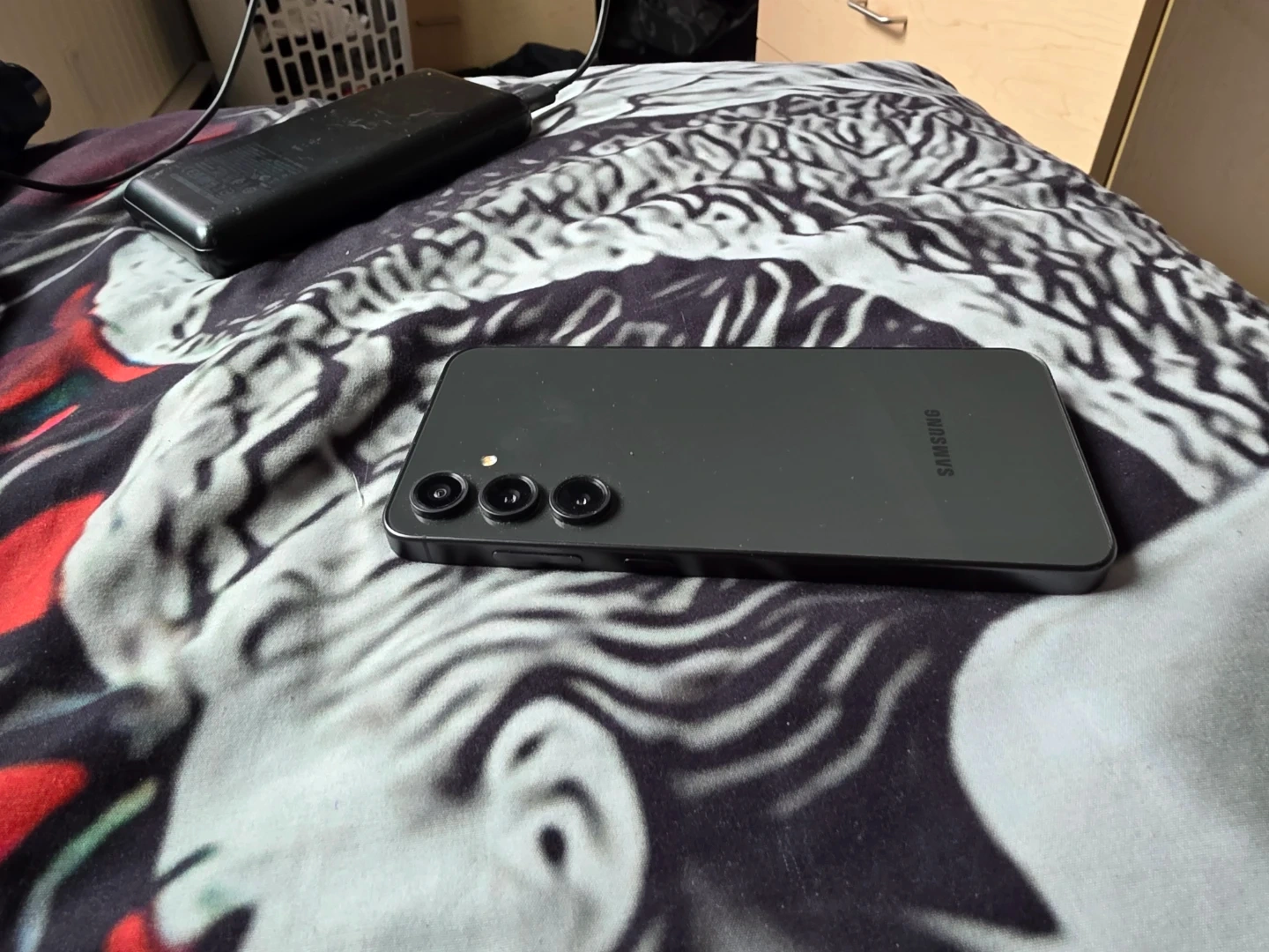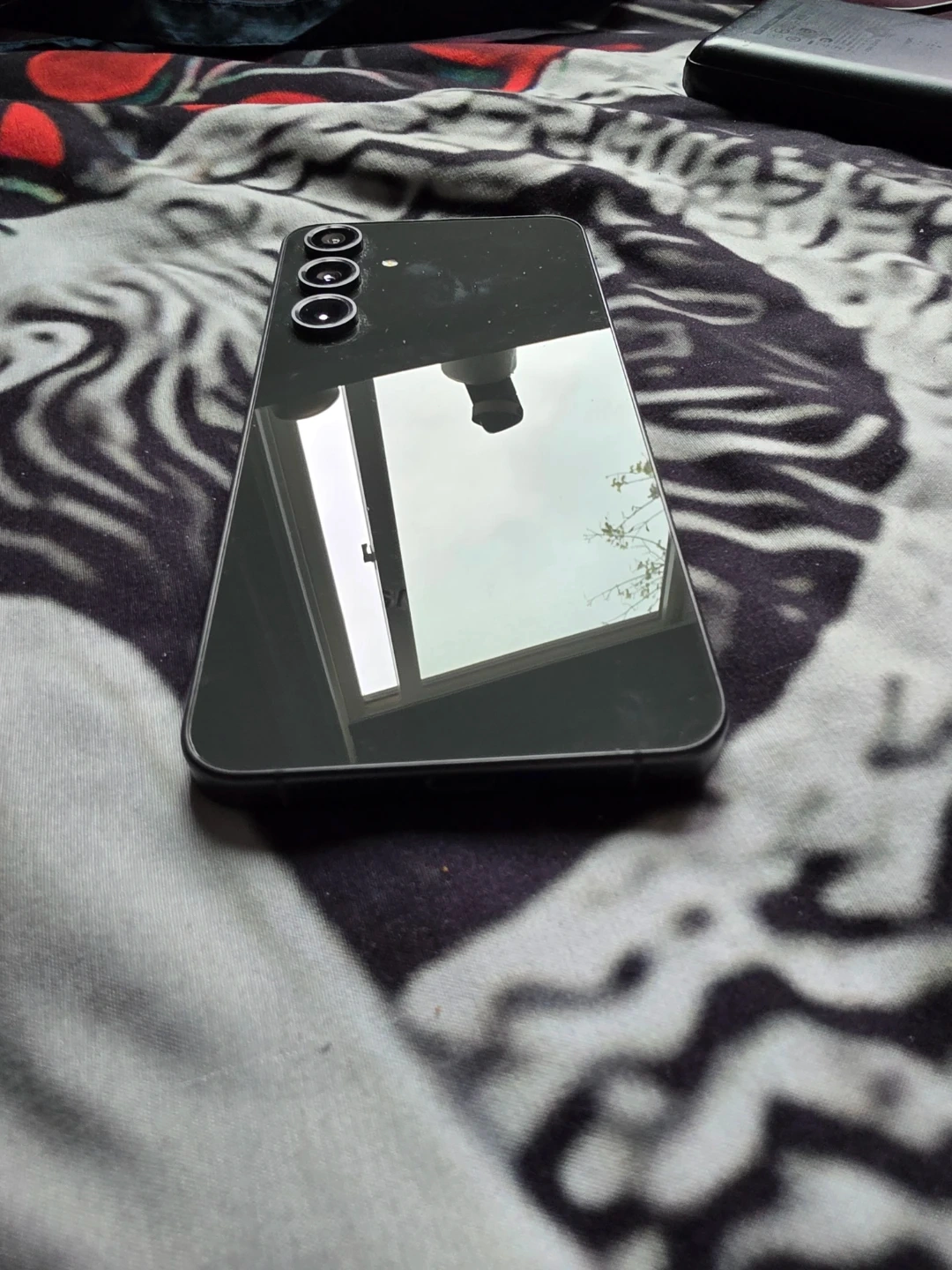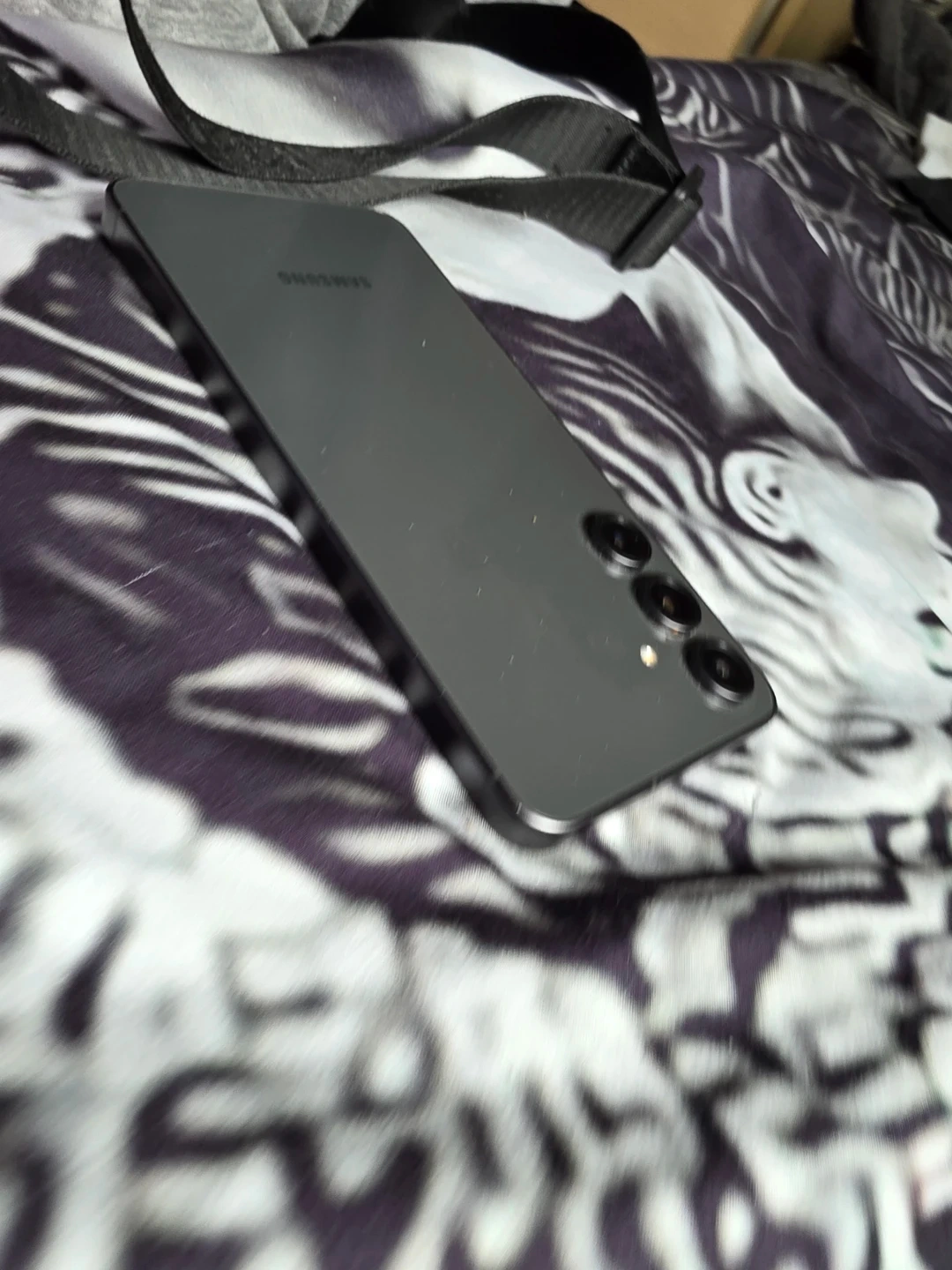 Samsung smartphone in a dark grey colour. It has a triple camera setup on the back. It's a great device for everyday use! The price just dropped too 200 dollars in total
