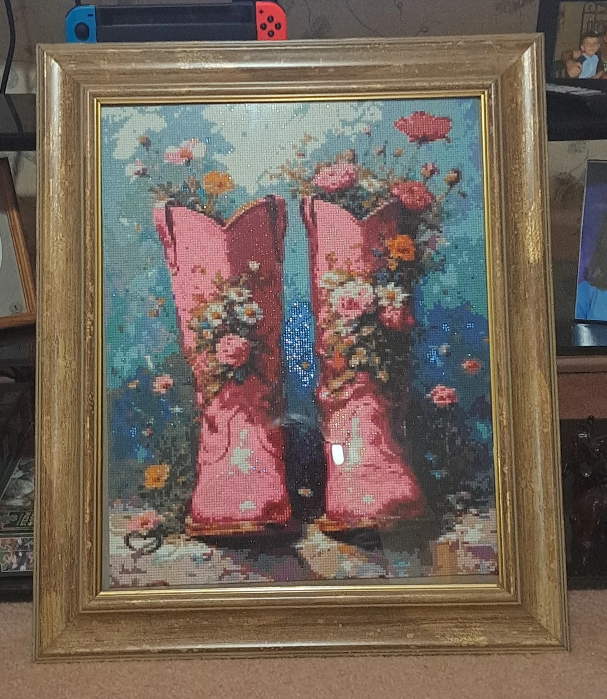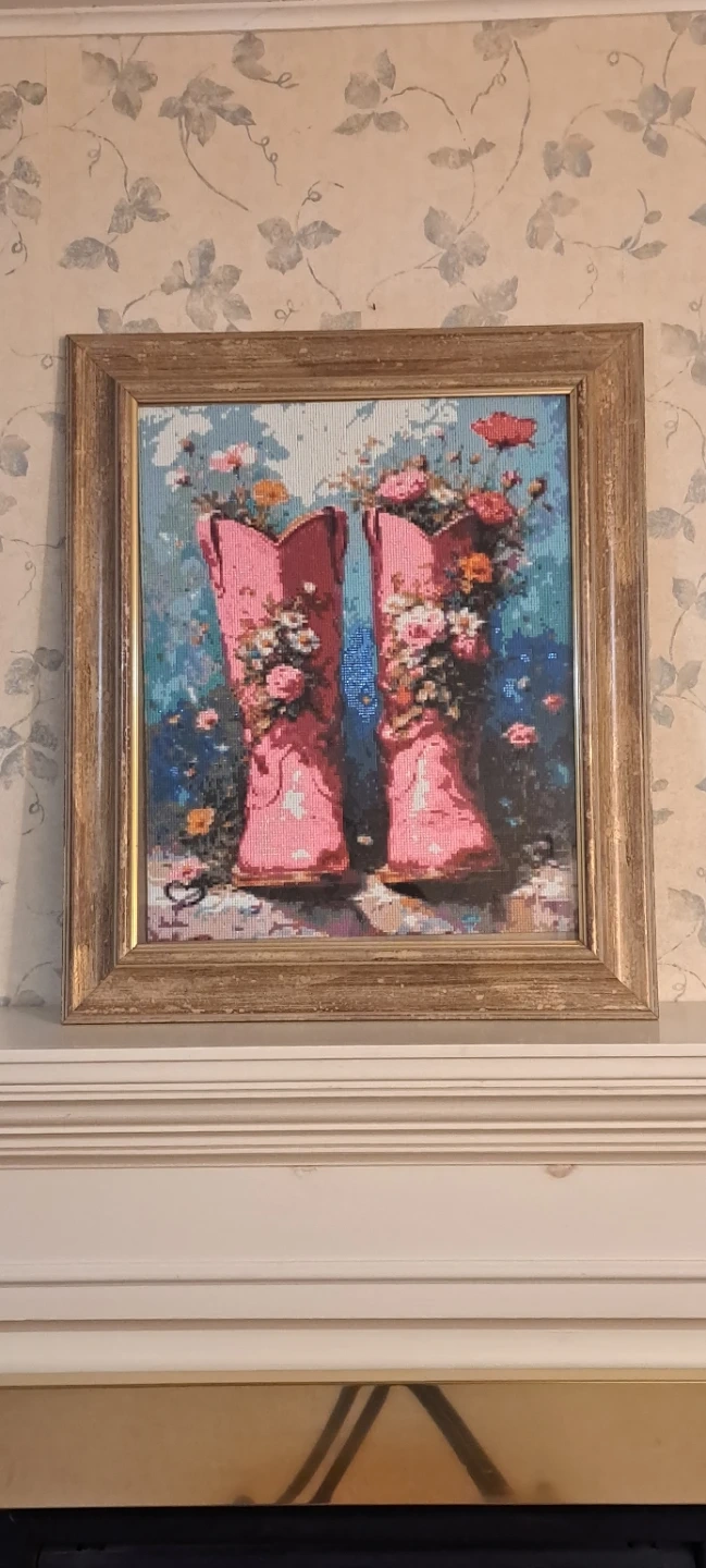 Diamond painting featuring a pair of pink cowboy boots overflowing with colourful flowers. Framed and ready to hang! This piece would brighten up any room!