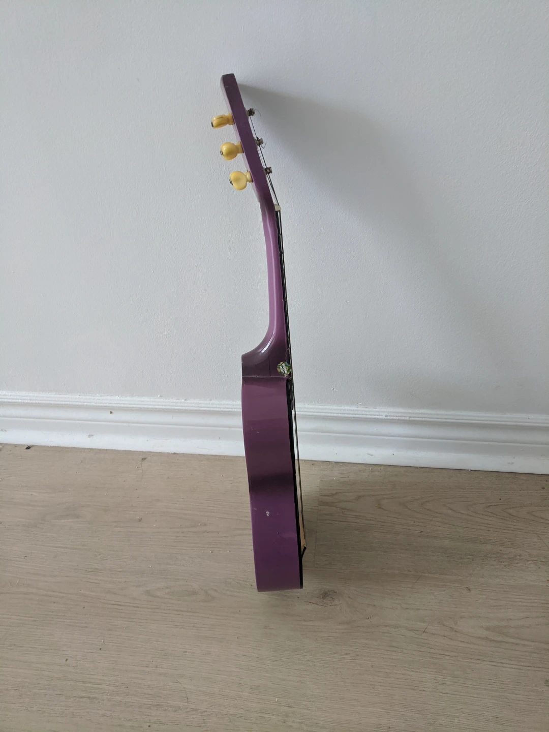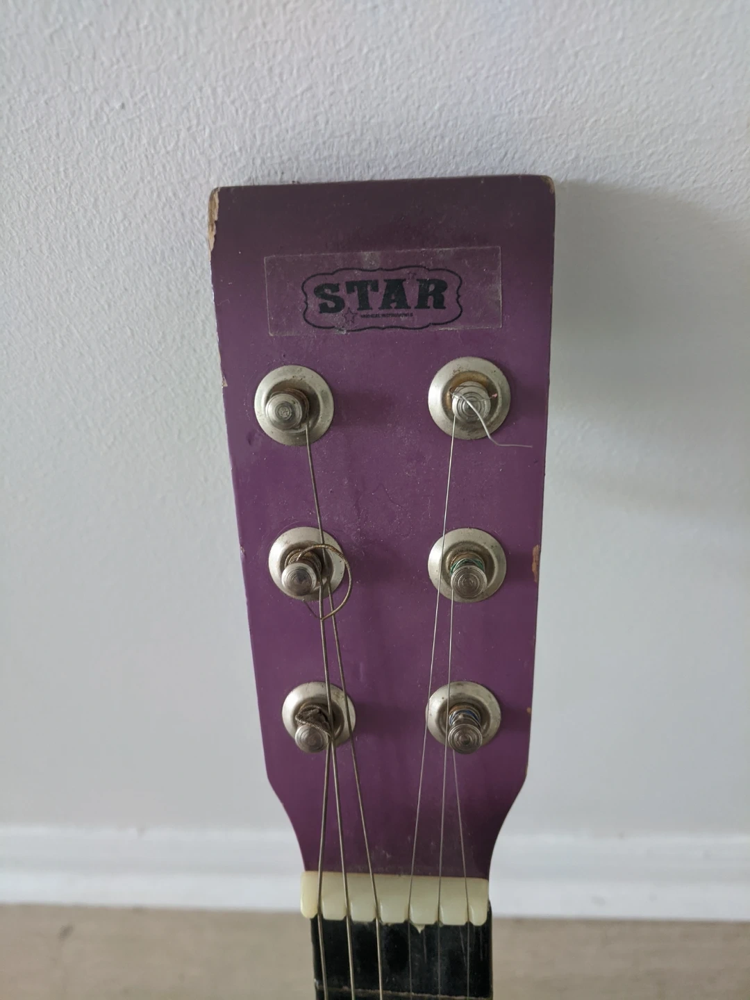 This is a purple STAR guitar. It's a fun size for kids to learn on! Has six strings and tuning pegs. Used but okay.