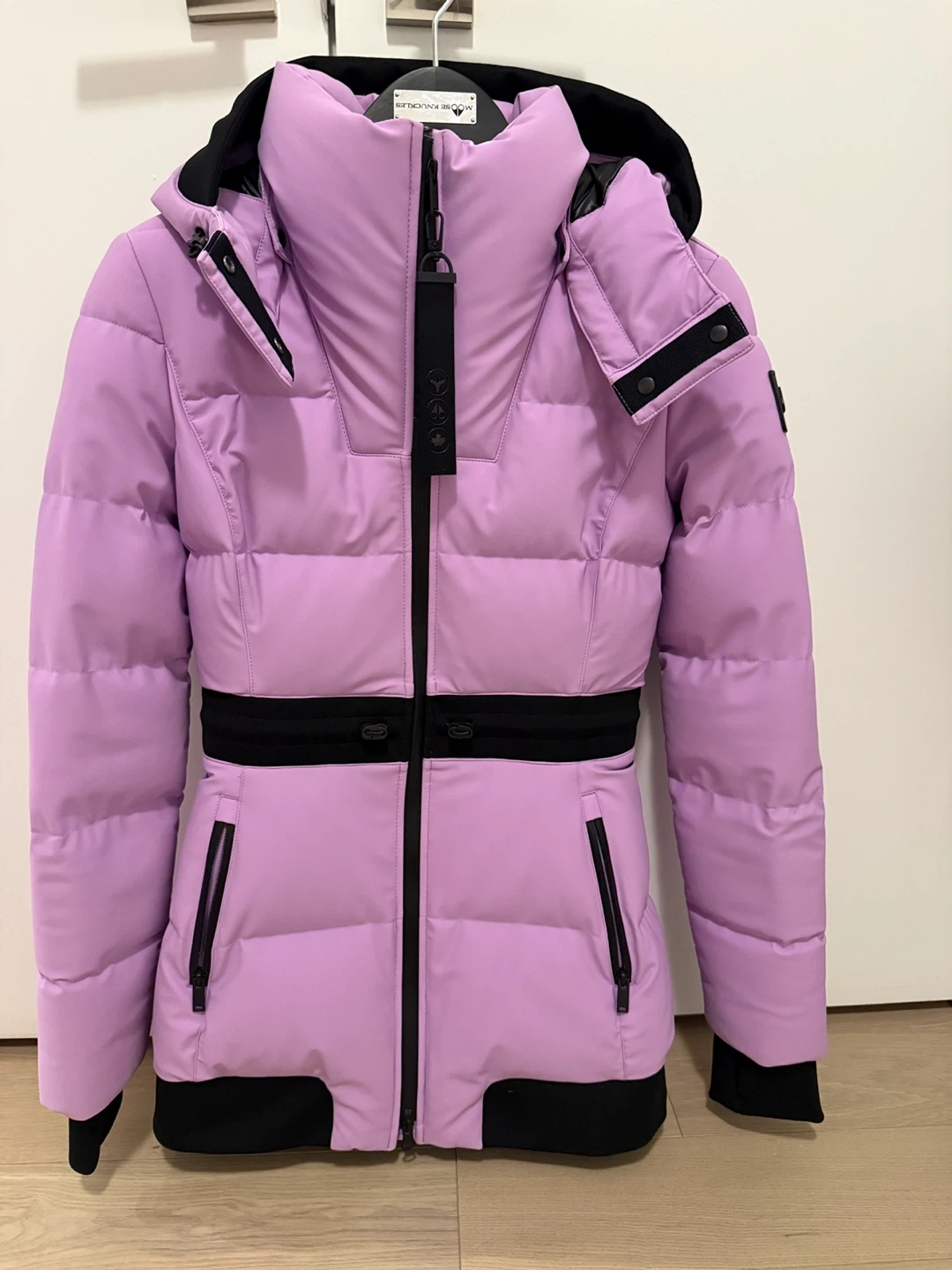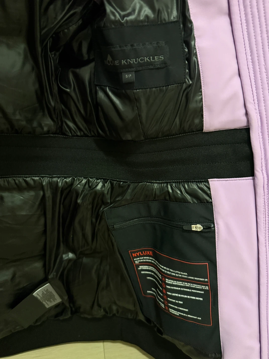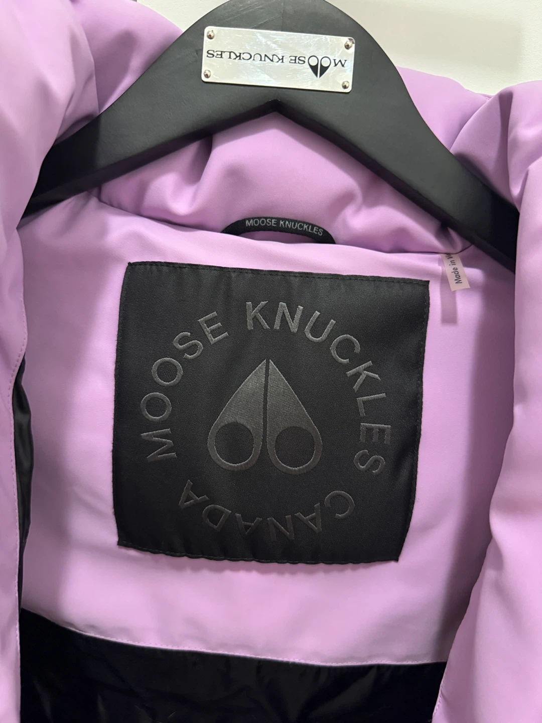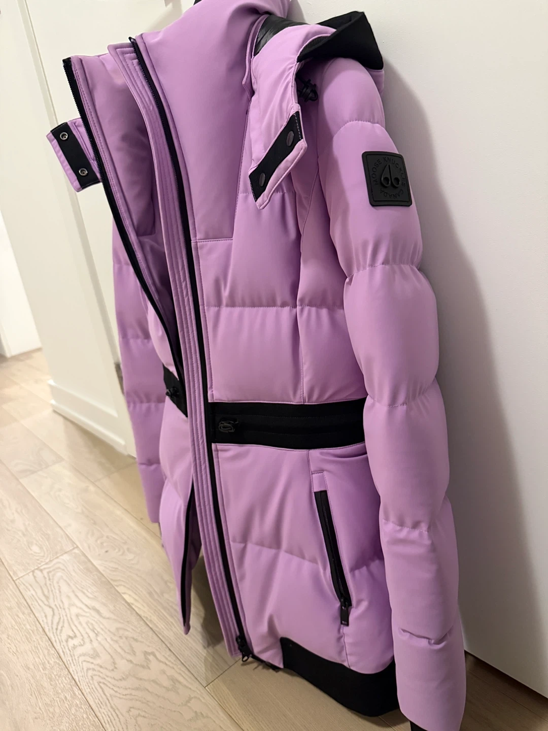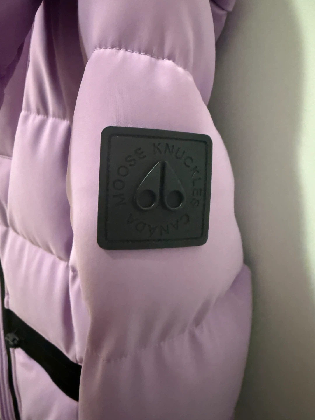 A stylish Moose Knuckles puffer jacket in a lovely lilac colour. It features a black banded waist and cuffs. This jacket is great for staying warm and looking fashionable during colder months. Bought it for $1400+ and only wore it 2 times
