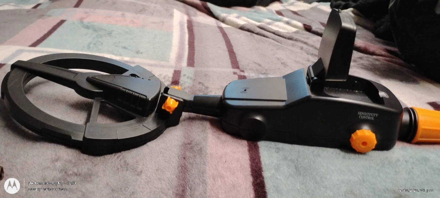 Black metal detector with orange accents. It has a sensitivity control dial. This detector is great for hobbyists looking for treasures.the only thing is the back plate that holds the battery in is missing. But it's brand new used if once and just never have time to get out too use it. It's a great deal so come on and get it.....