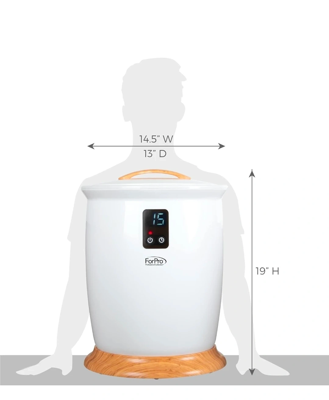 This electric towel warmer is from ForPro Professional Collection. It features a digital display and a timer function. Dimensions are 14.5" W x 13" D x 19" H. It's designed for warming towels.