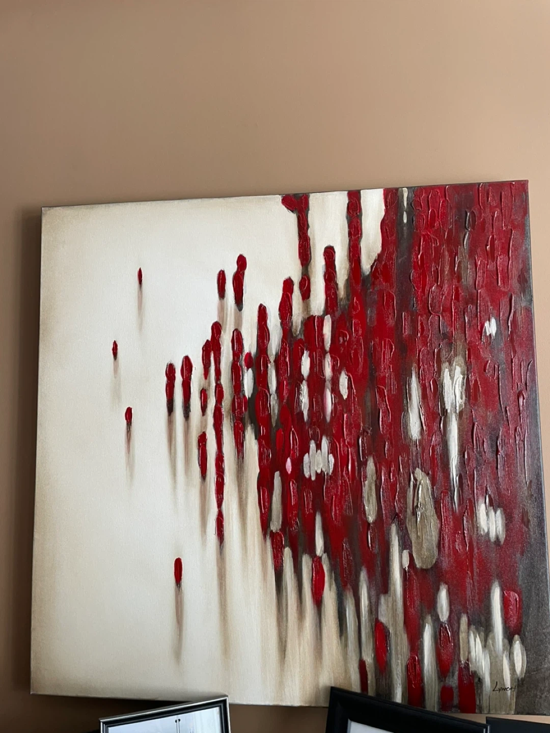This is a textured abstract canvas painting with bold red strokes and subtle beige tones. It's a striking piece that would add a modern touch to any room. Approximate size: 40 x 40 inches. Pet free smoke free home.