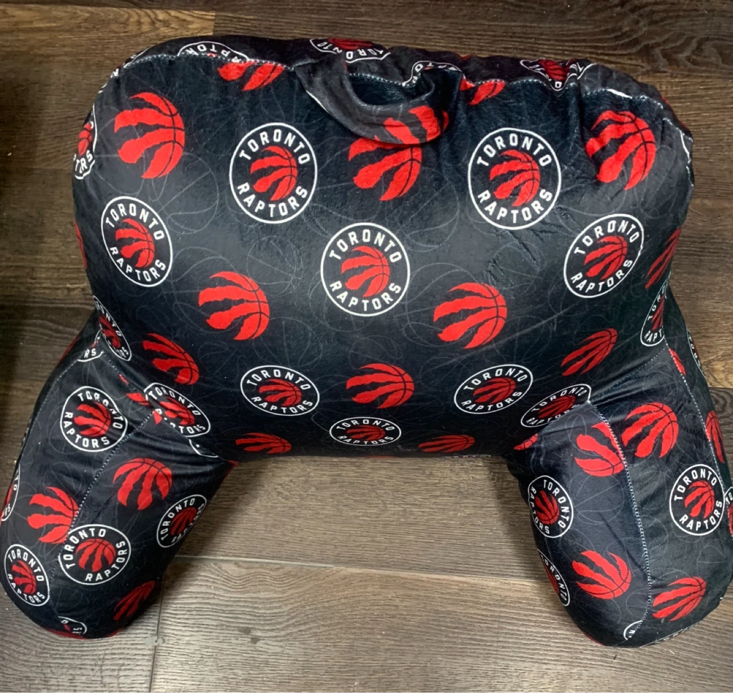 Toronto Raptors fan support pillow. Black with all-over team logo and basketball pattern. Features a convenient carrying handle. Great for reading or lounging!