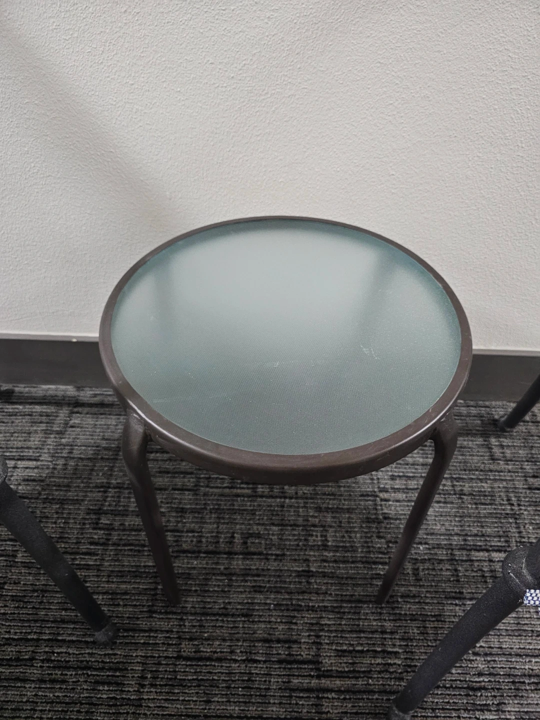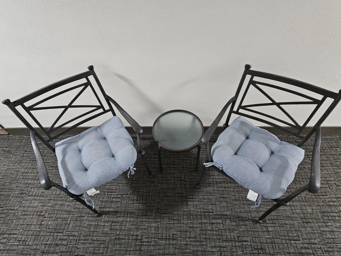 This used metal outdoor bistro set includes two chairs and a small table, perfect for a cozy patio or balcony! The set has a bronze-coloured finish and comes with comfortable blue seat cushions. Ideal for enjoying morning coffee or evening cocktails.