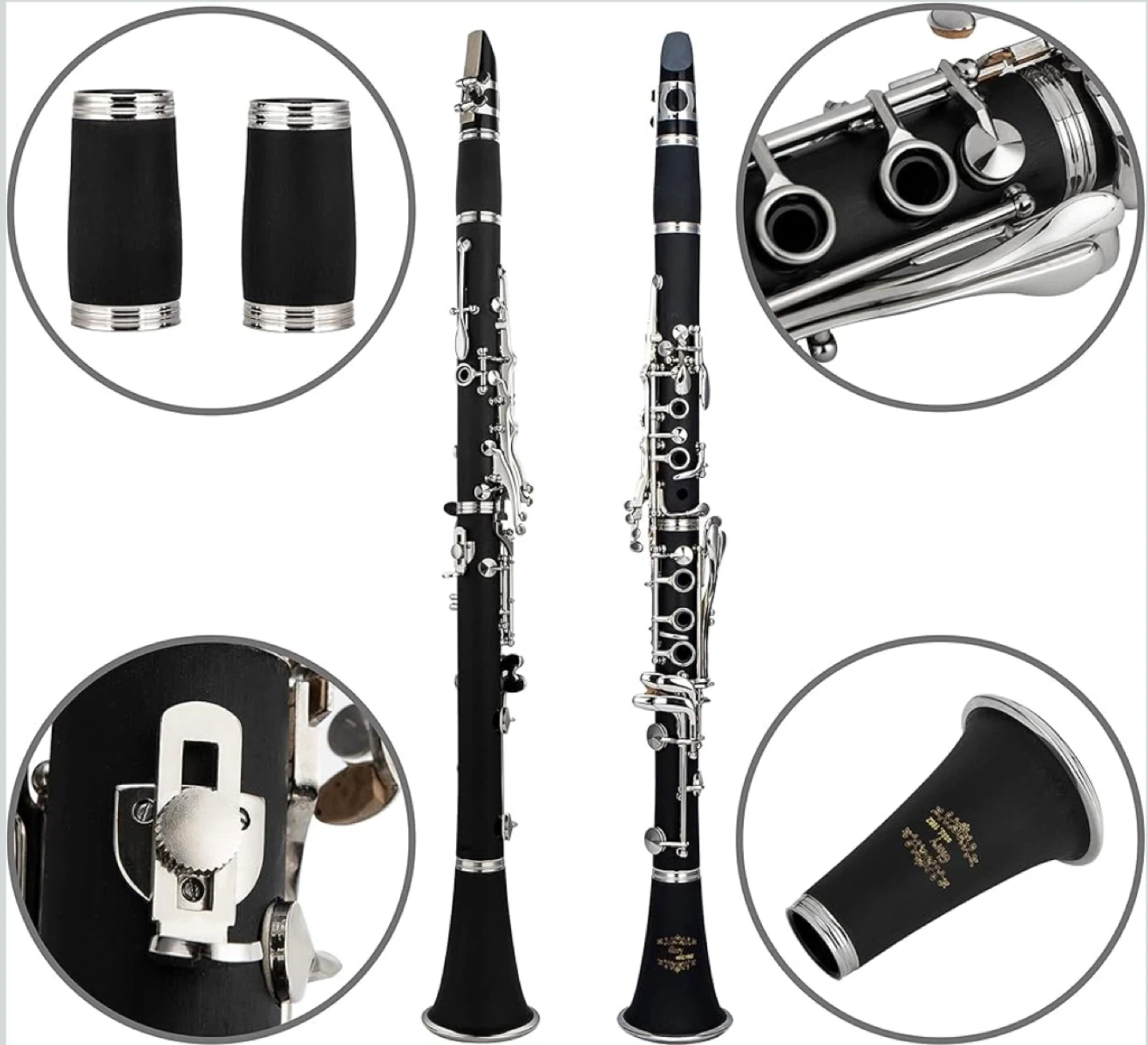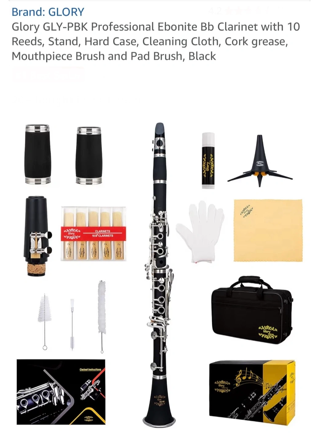 GLORY GLY-PBK Professional Ebonite Bb Clarinet. It's black and includes 10 reeds, a stand, a hard case, cleaning cloth, cork grease, mouthpiece brush, and pad brush. Great for beginner musicians!