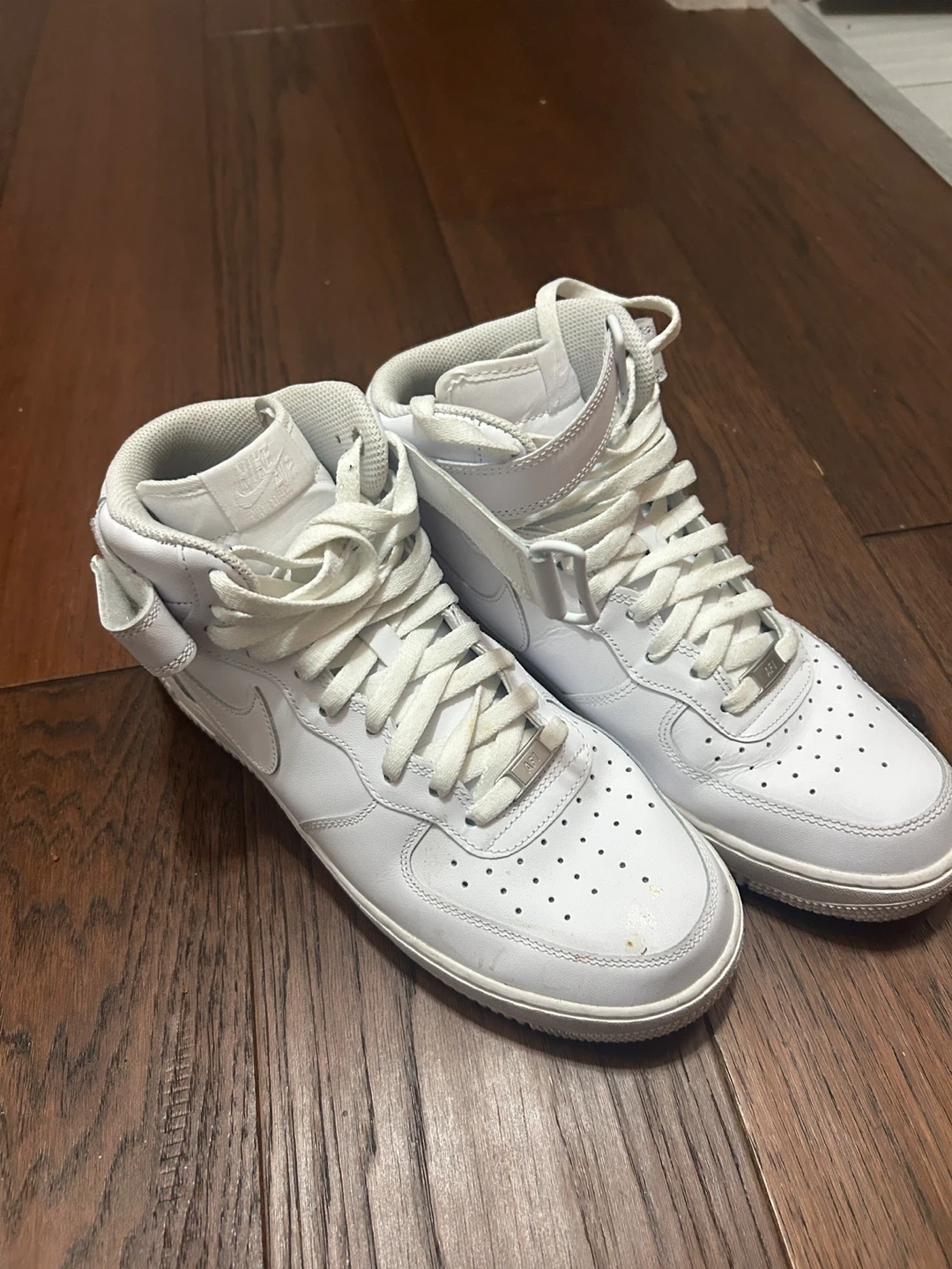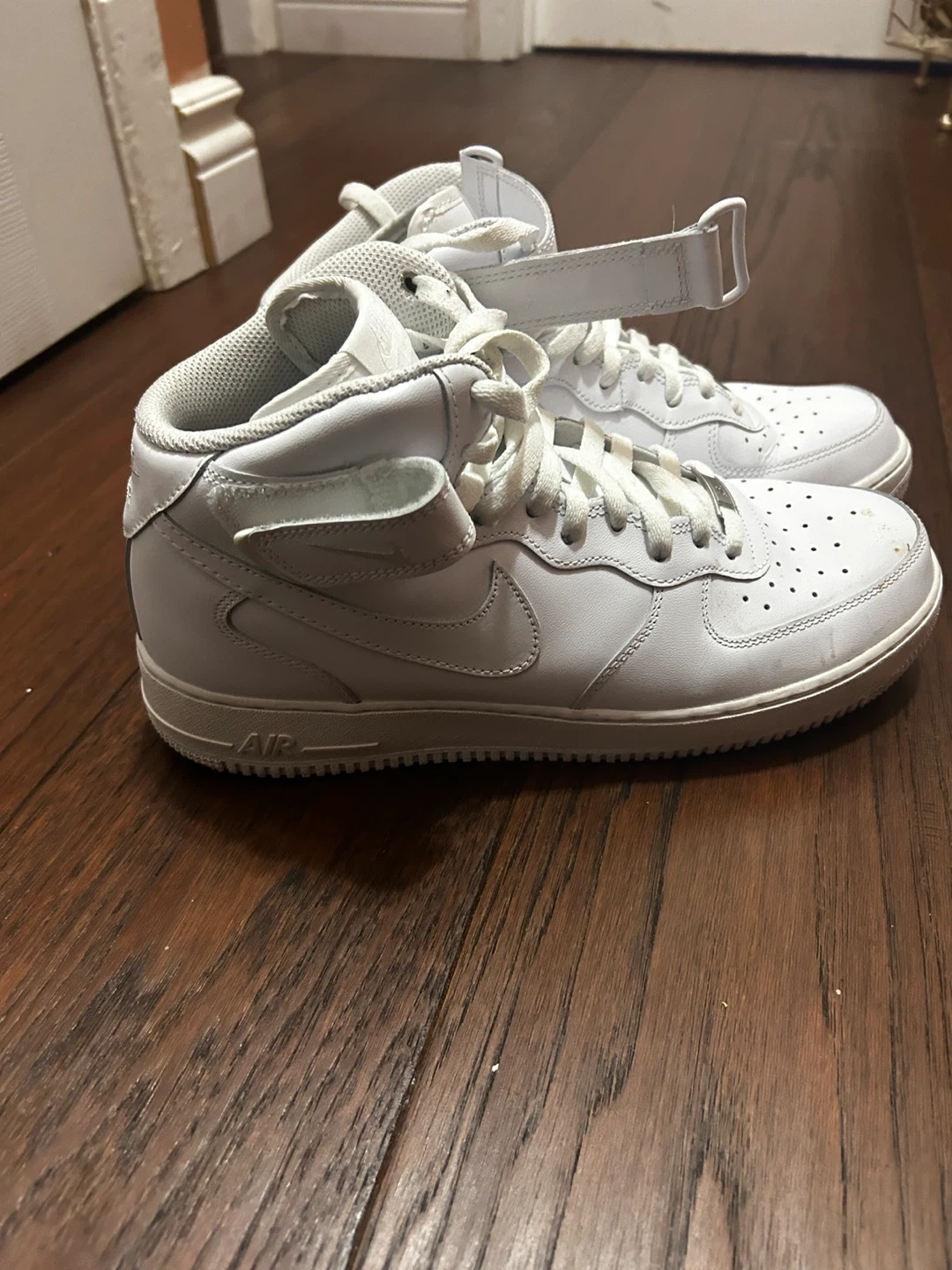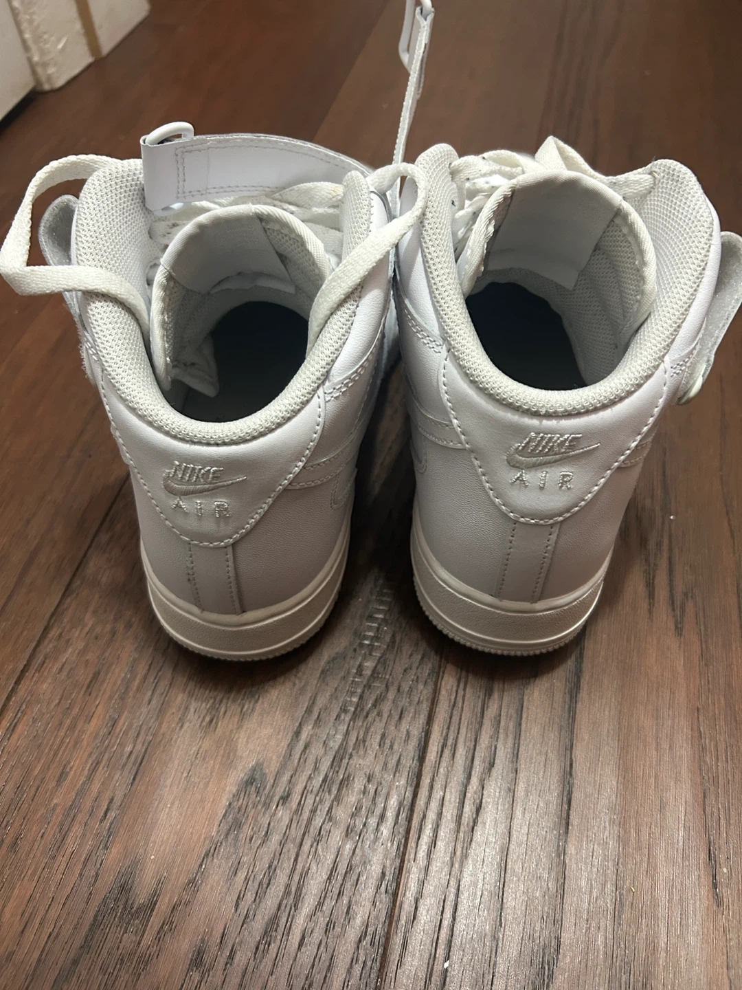 These are white Nike Air Force 1 Mid sneakers. Leather material. These sneakers are great for everyday wear.