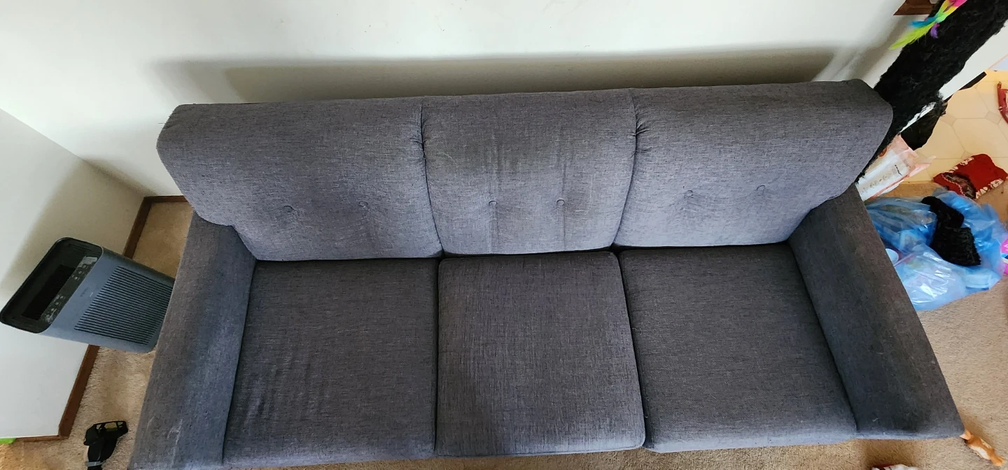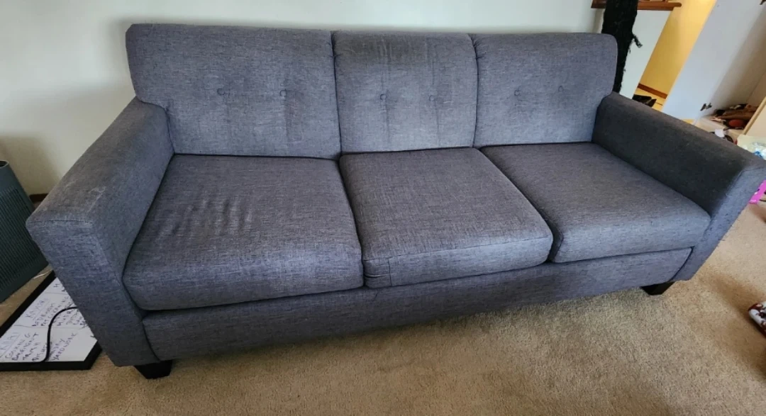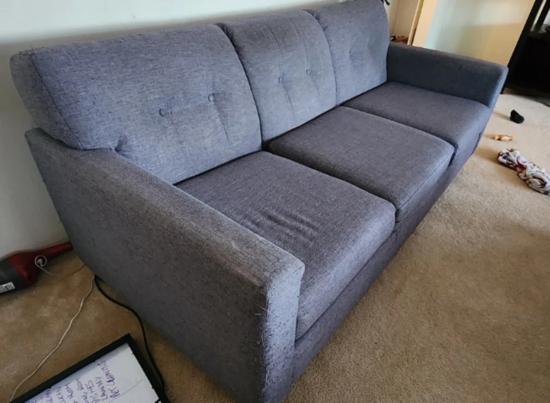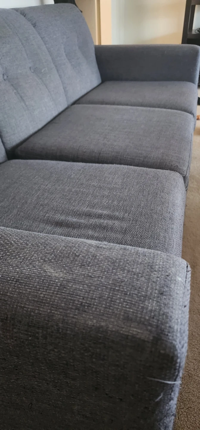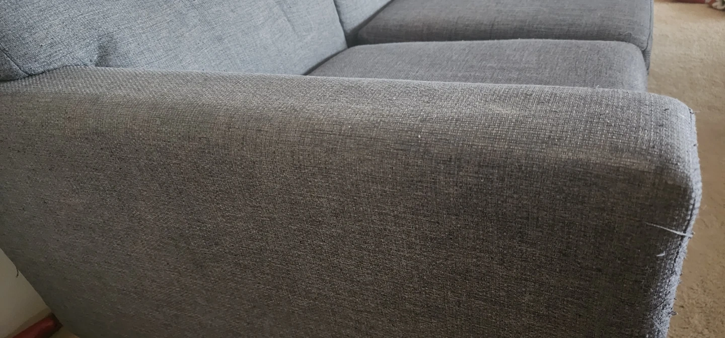 A grey sofa with three cushions. Upholstered in a textured fabric. Some pilling is visible on the arms and seat cushions.
