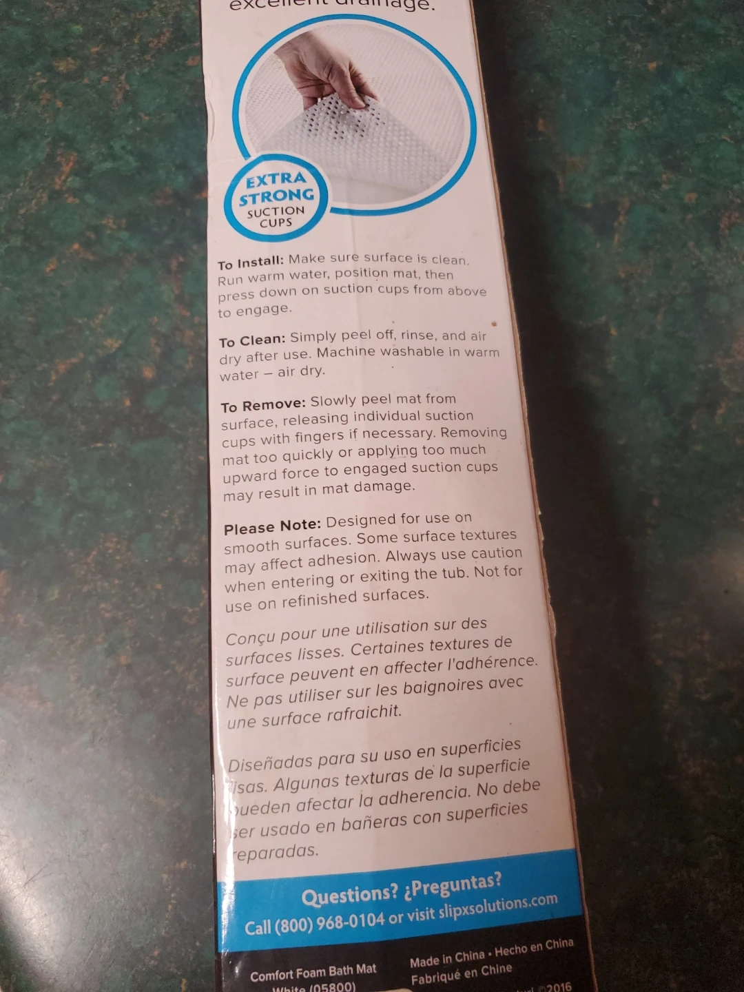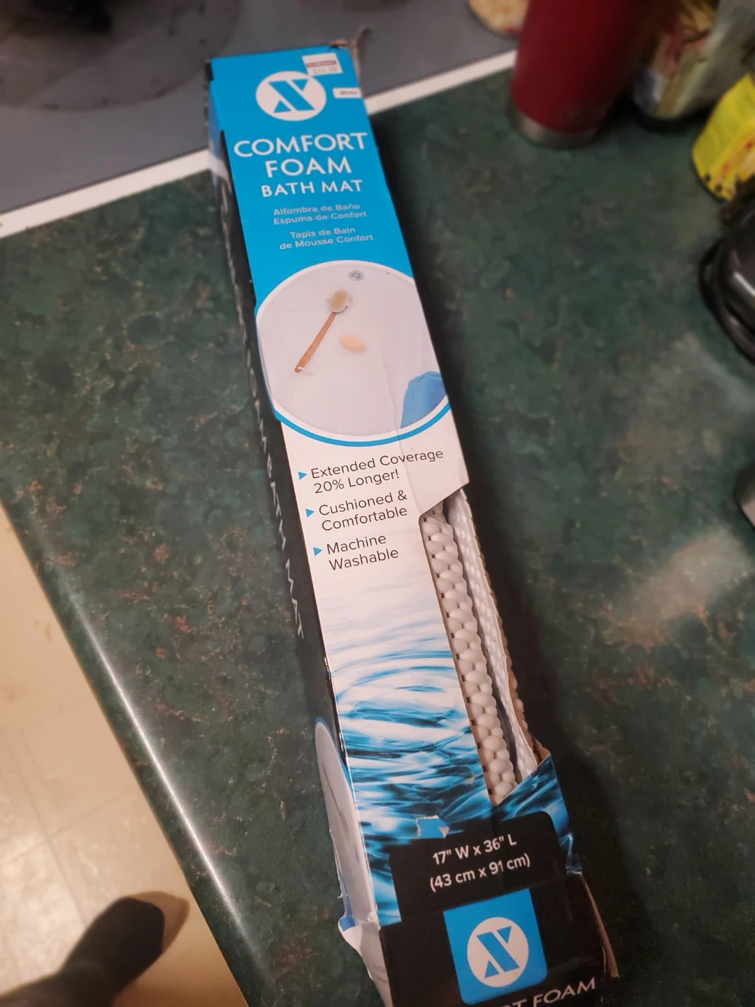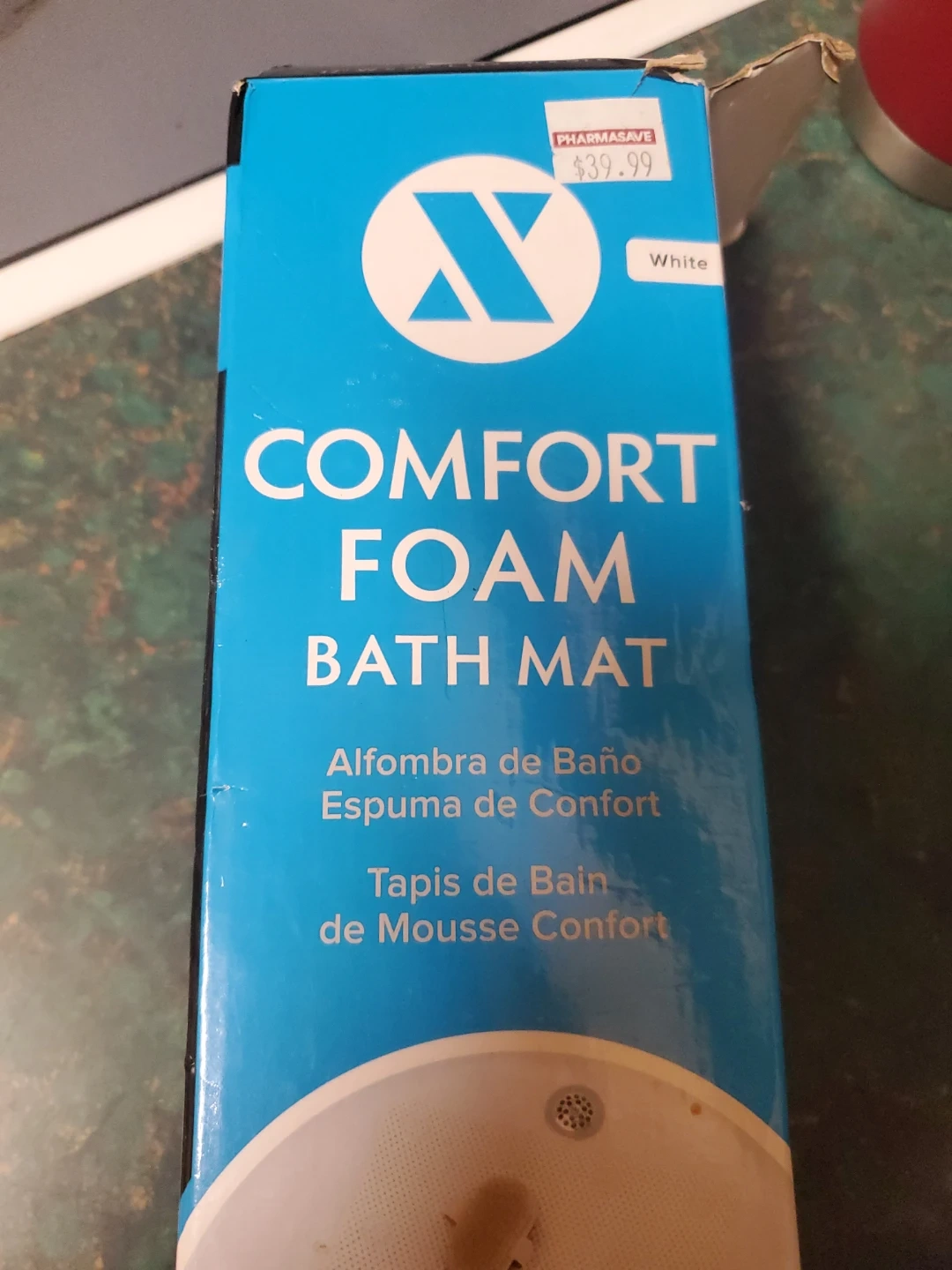 This is a white Comfort Foam bath mat, measuring 17" wide by 36" long. It's cushioned and comfortable, designed for extended coverage. The mat is machine washable for easy care. New. Box is Damaged but contents not. Cedar pick up.