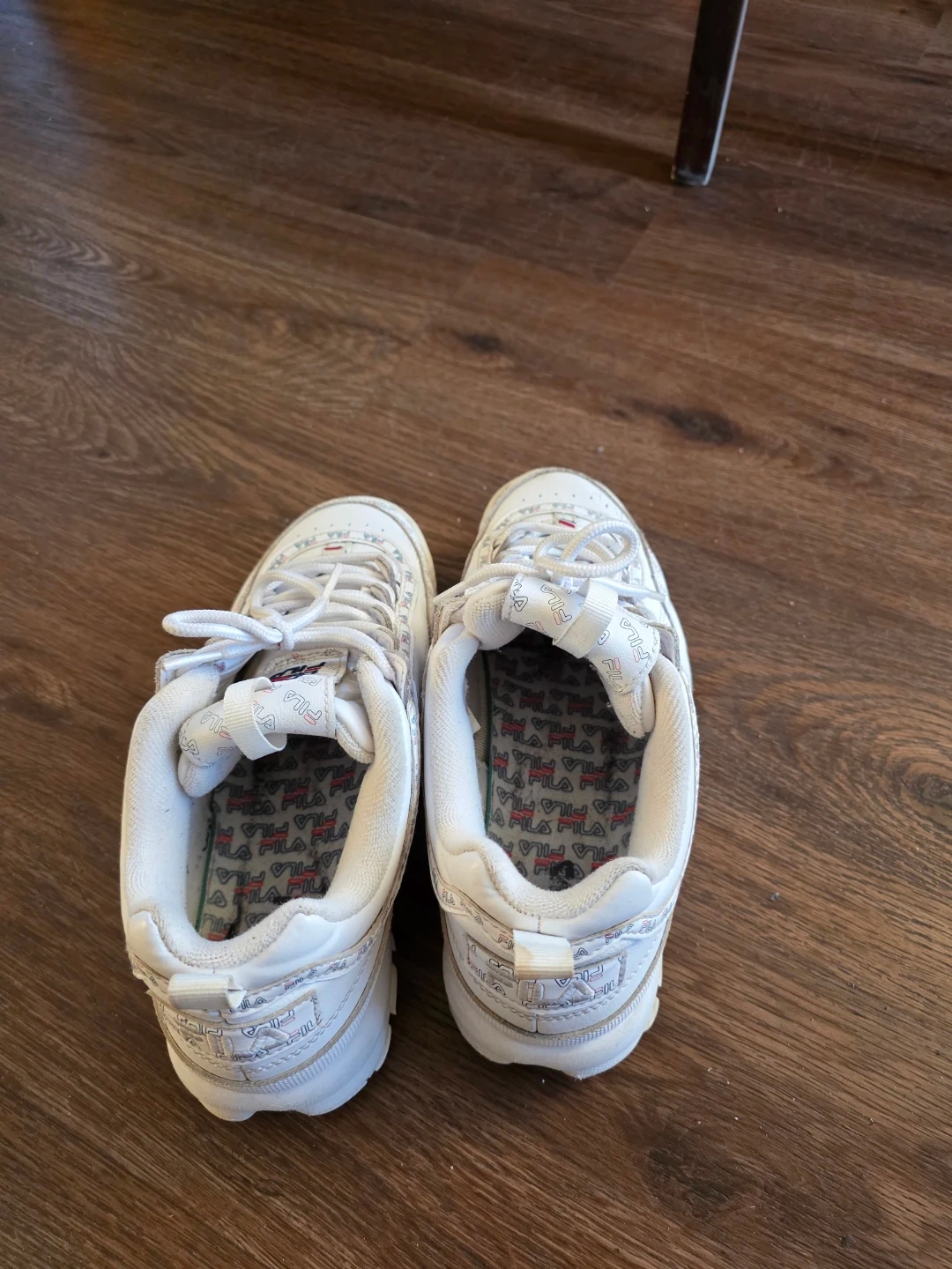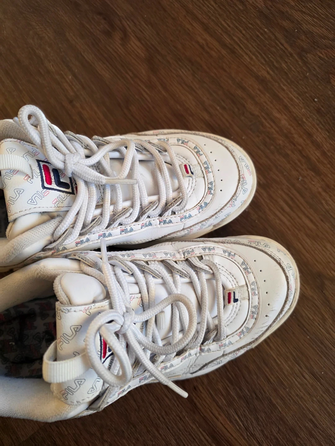 These white Fila Disruptor II sneakers feature all-over Fila logo detailing. Comfortable and stylish footwear. These are limited edition with the logo all over the shoe accents.