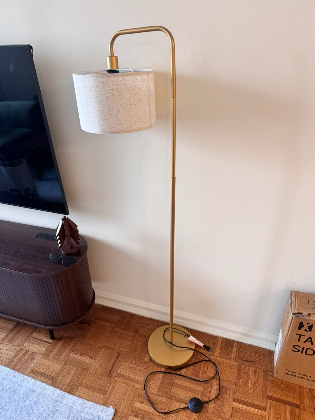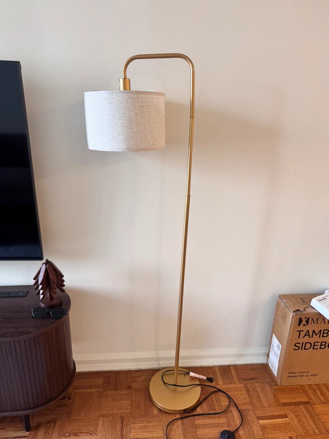This modern arc floor lamp features a sleek gold-tone metal stand and a white linen drum shade. It's ideal for adding ambient lighting to living rooms or bedrooms. The lamp includes a foot switch for easy operation.
