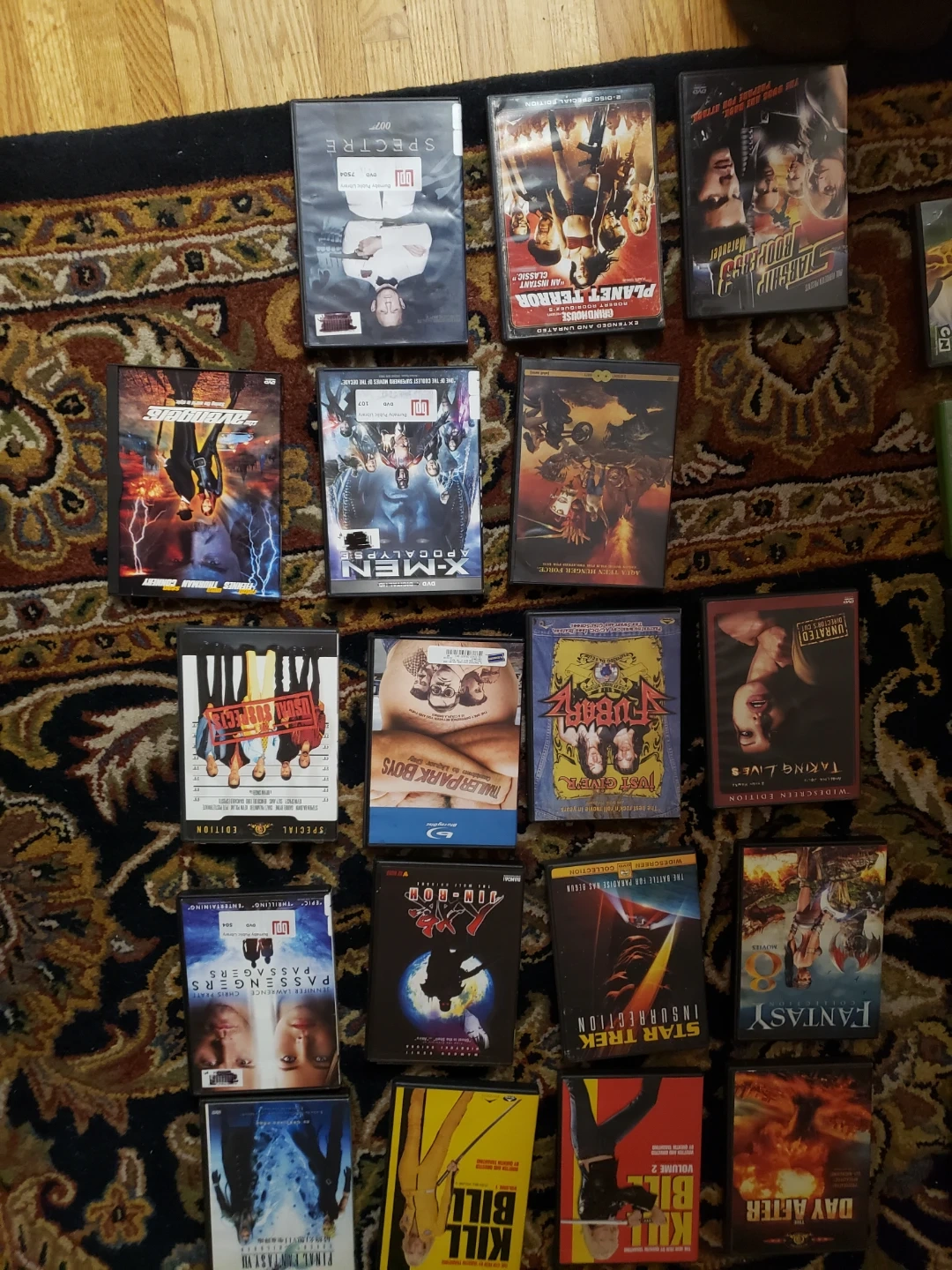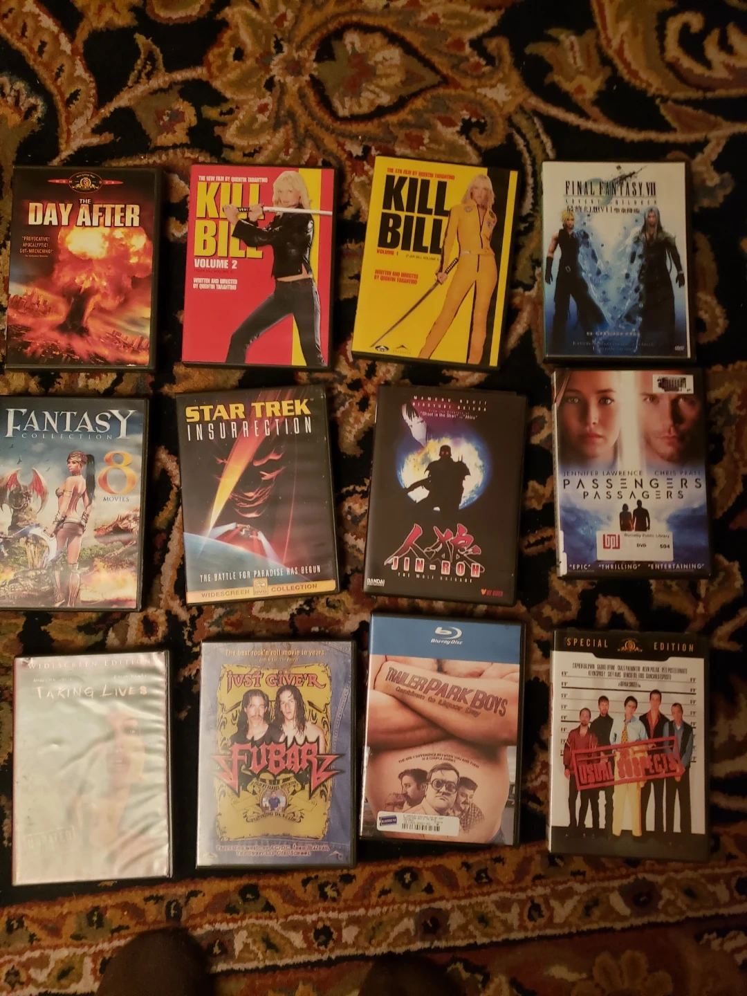 Collection of various movies including "The Day After", "Kill Bill Vol. 1 & 2", "Final Fantasy VII", "Star Trek Insurrection", "Jin-Roh", "Passengers", "Taking Lives", "Just Give Me Your Arse", "Trailer Park Boys", "Us Versus Them", "X-Men: Apocalypse", and "Fantasy 8". Some are DVDs and some are Blu-rays. Look at the images to see all the titles. Buy all for 3 each, or ask for any and I will send you a price. See my other listing for more movies.