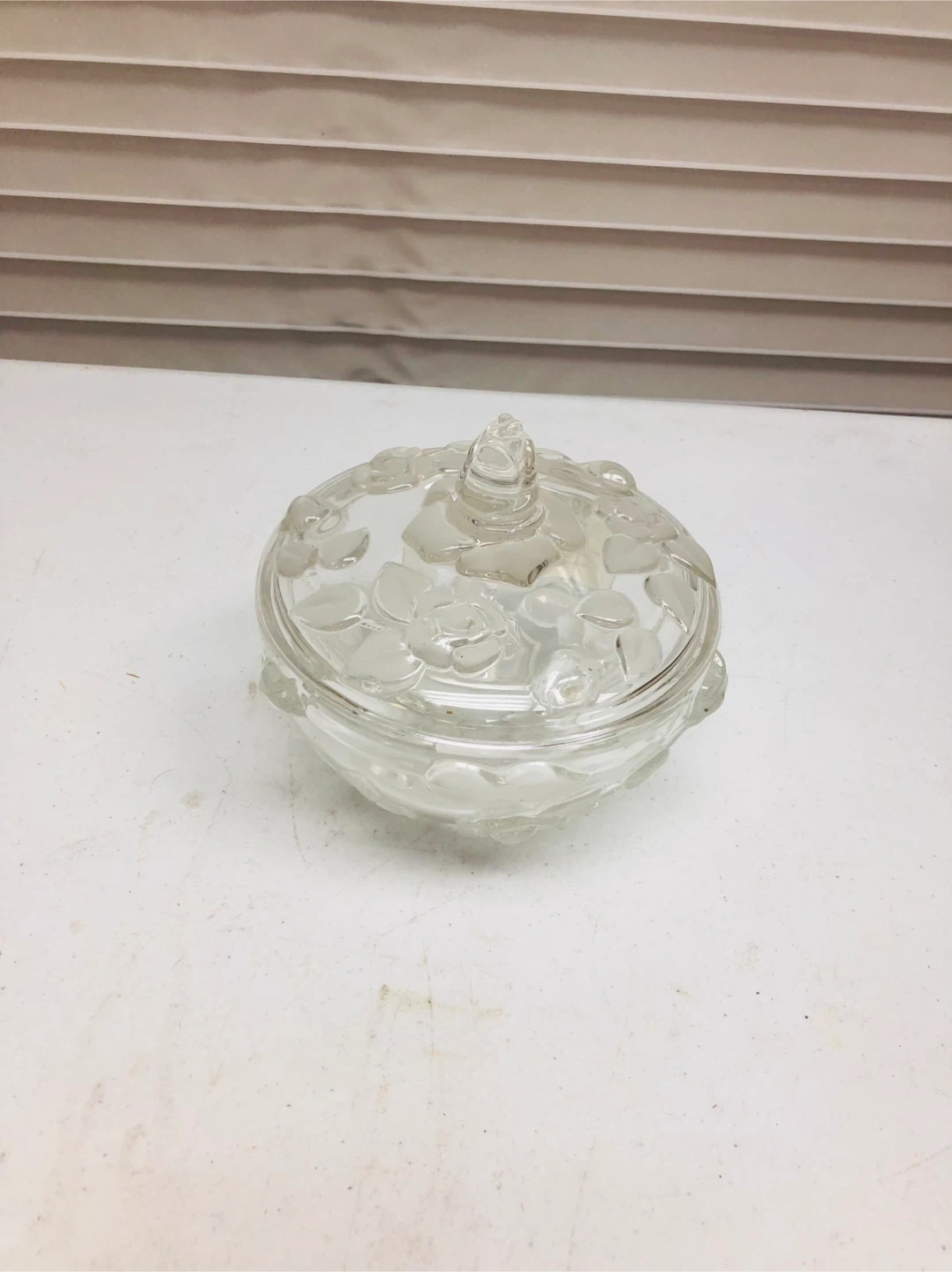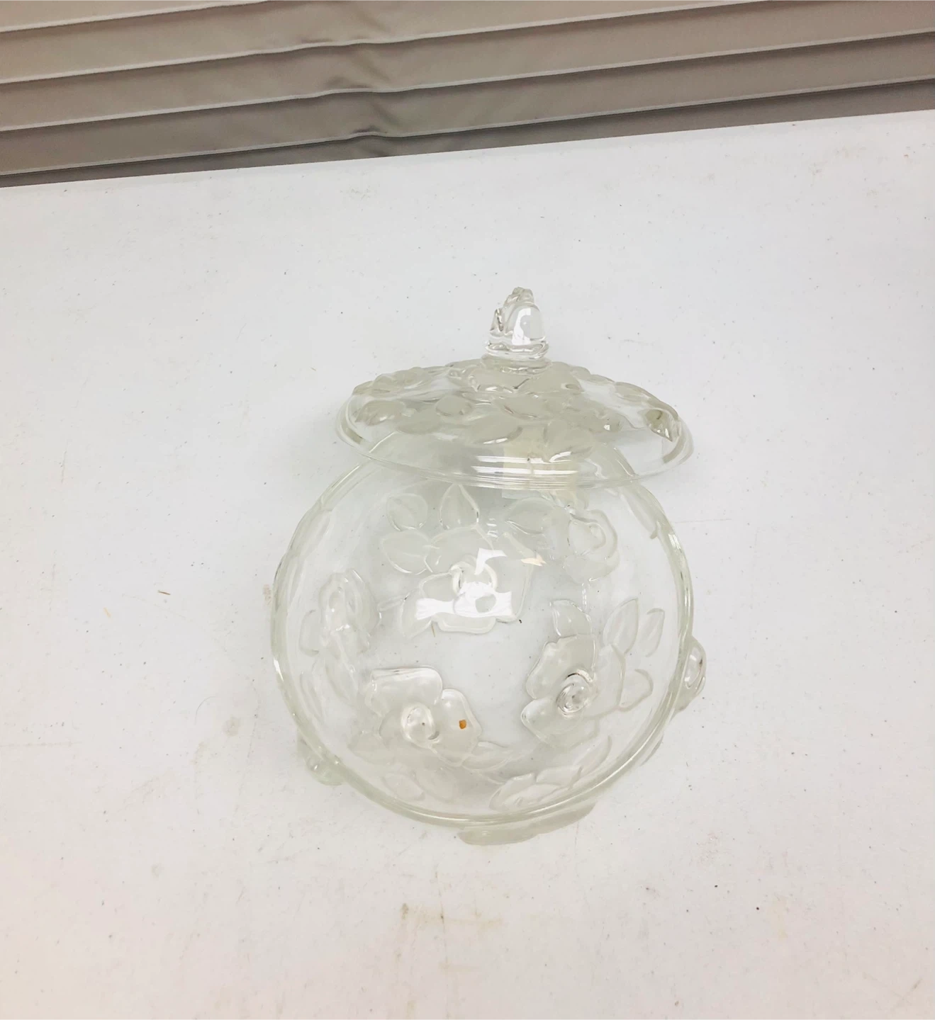 This clear glass dish comes with a matching lid, perfect for storing candies or small trinkets. It features a floral embossed design all around the bowl and on the lid. Glass material.