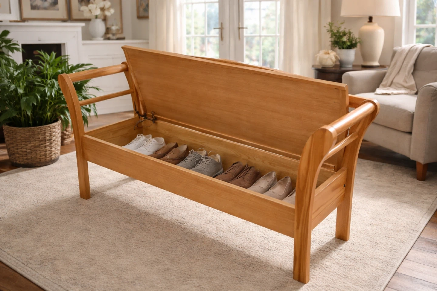 Pine Storage Bench with Lift-Top, Natural Light Wood, Seats Two