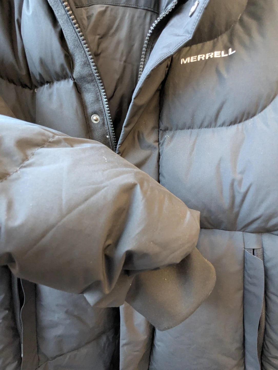 Merrell women's long puffer jacket. Black. Warm and cozy. Excellent for winter. Fit Medium size