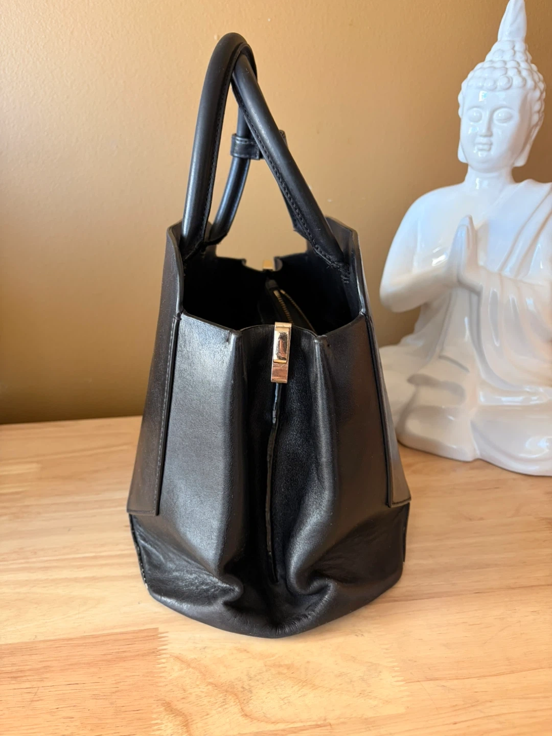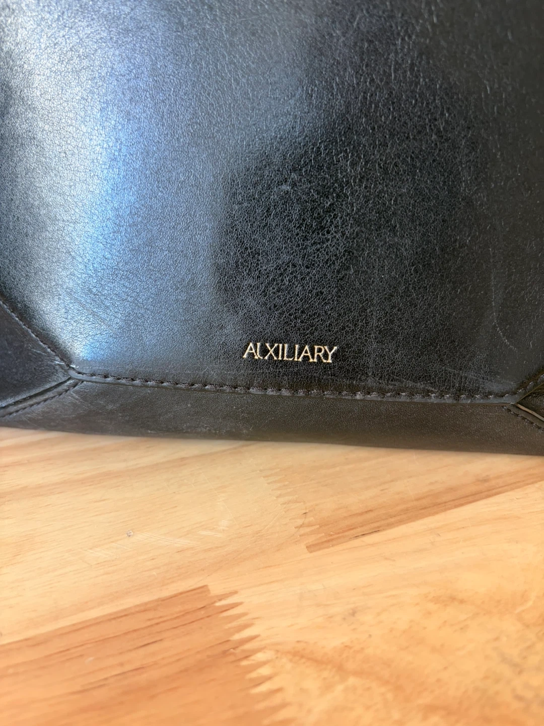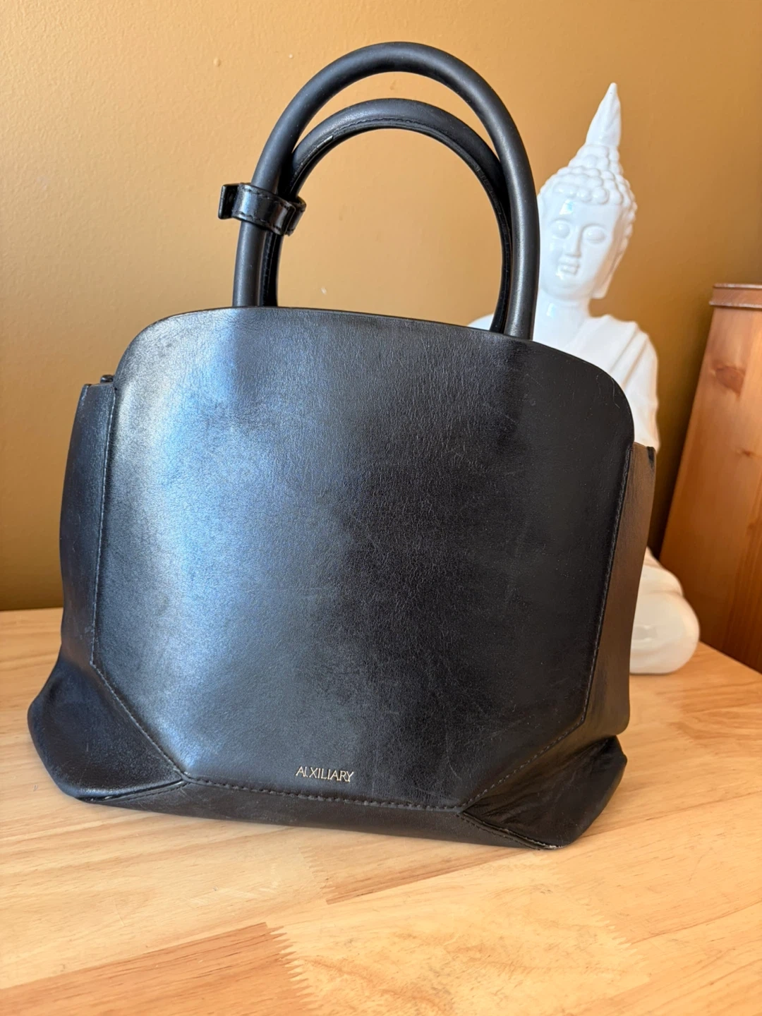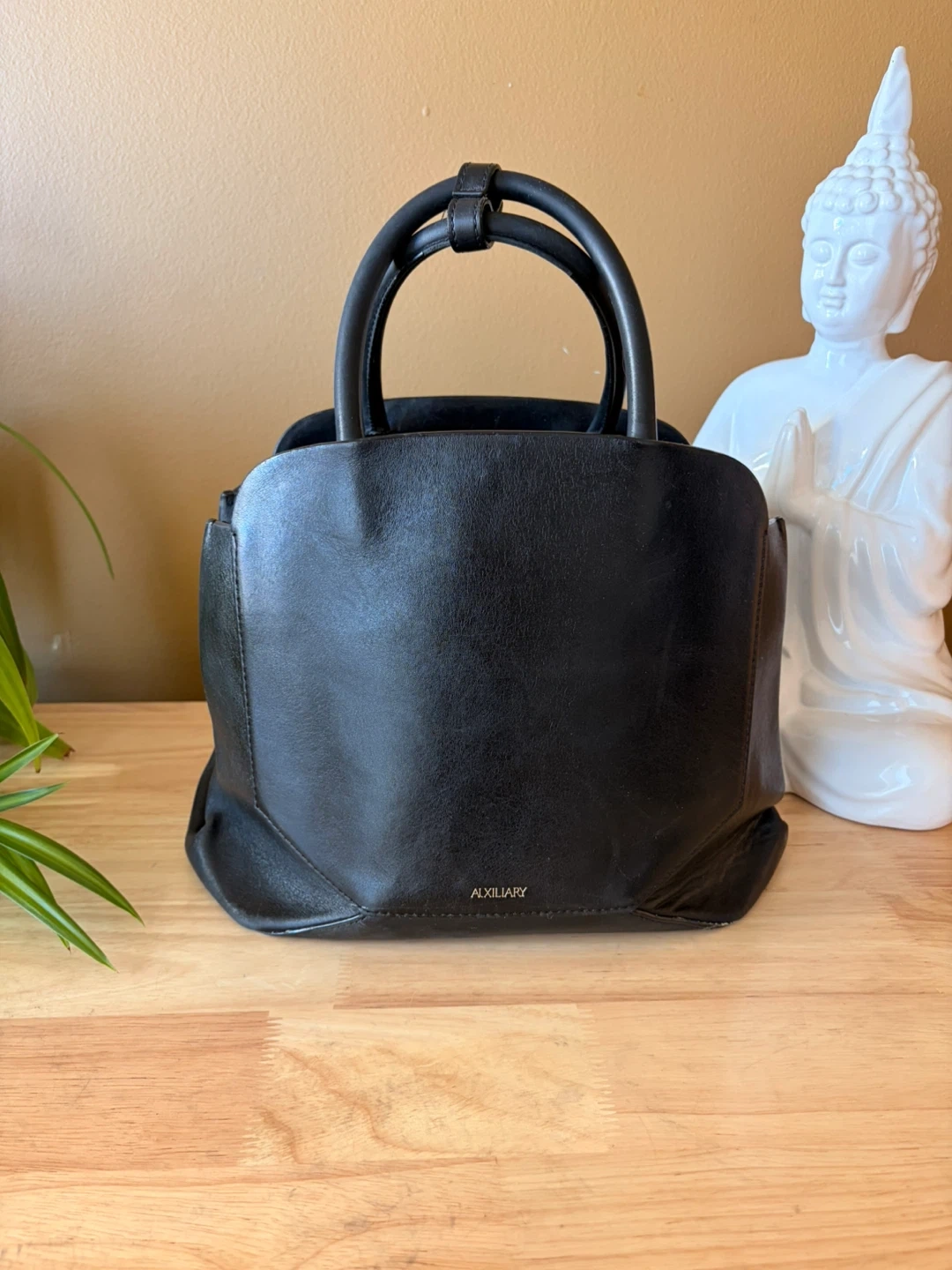 This is a black leather handbag from Auxiliary. It features a structured design and top handles. Made with genuine leather.