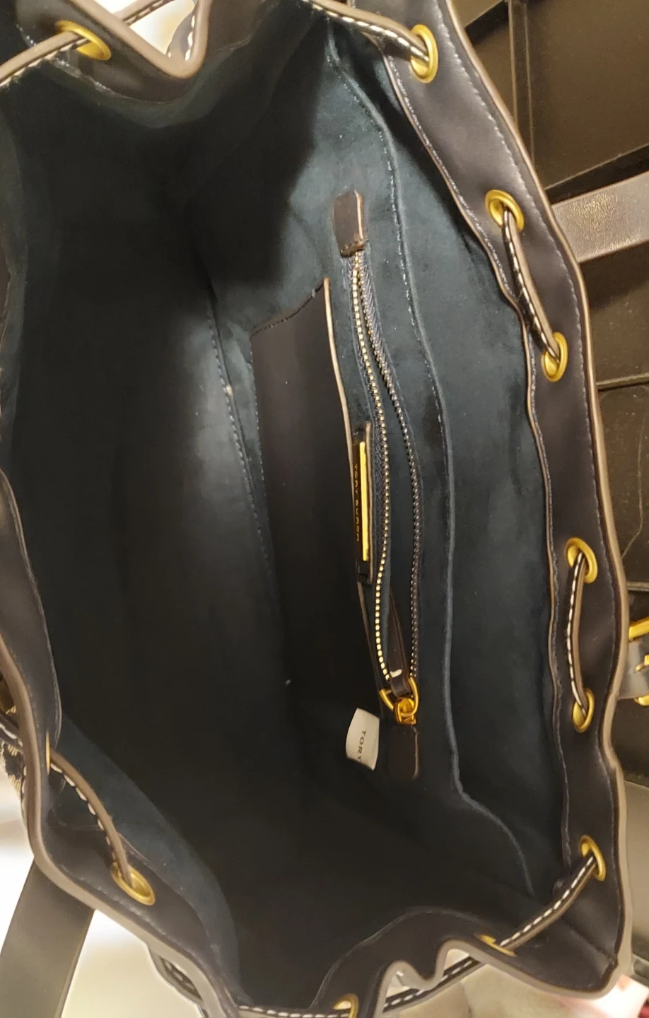 Tory Burch tote bag with signature logo pattern. Interior features a zip pocket and additional slip pockets. Leather trim and handles.