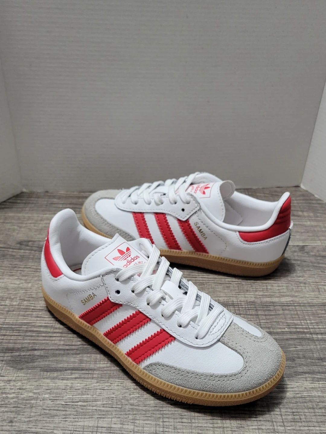 Adidas Samba sneakers in white with red accents. Features the classic three stripes and gum sole. Made in India. Size 11K.