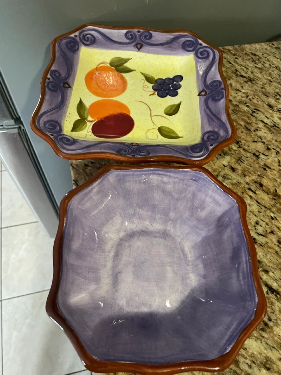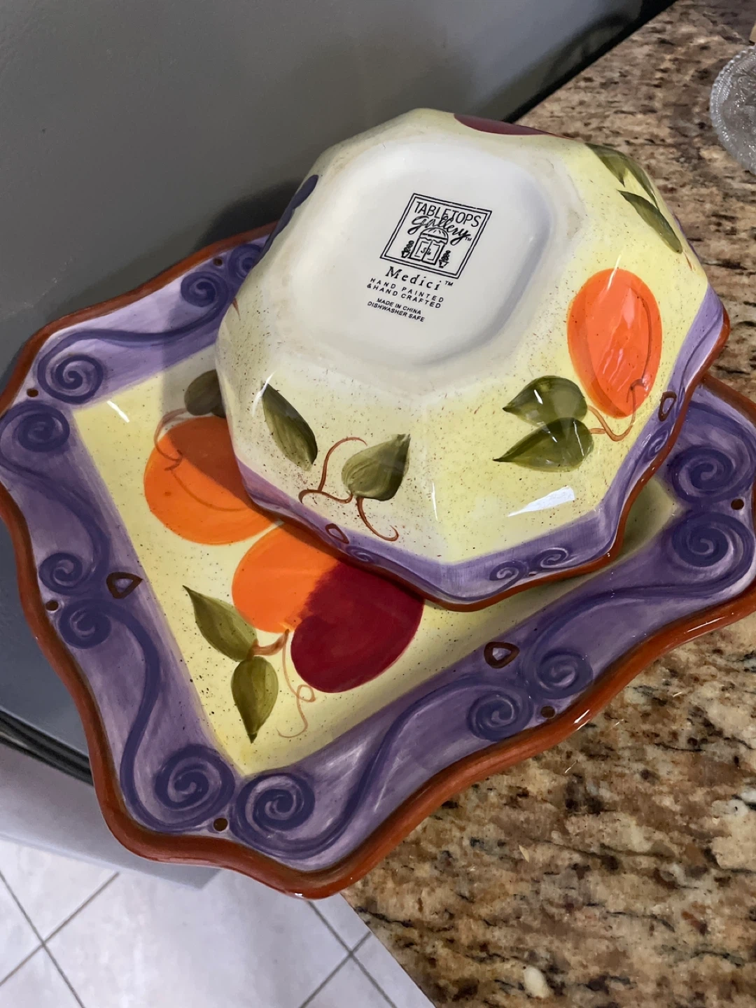Selling a charming bowl and plate set from Tabletops Gallery, featuring the Medici design! The set showcases a delightful fruit pattern with vibrant oranges, grapes, and plums, complemented by a lovely purple trim. Perfect for adding a touch of whimsy to your table setting