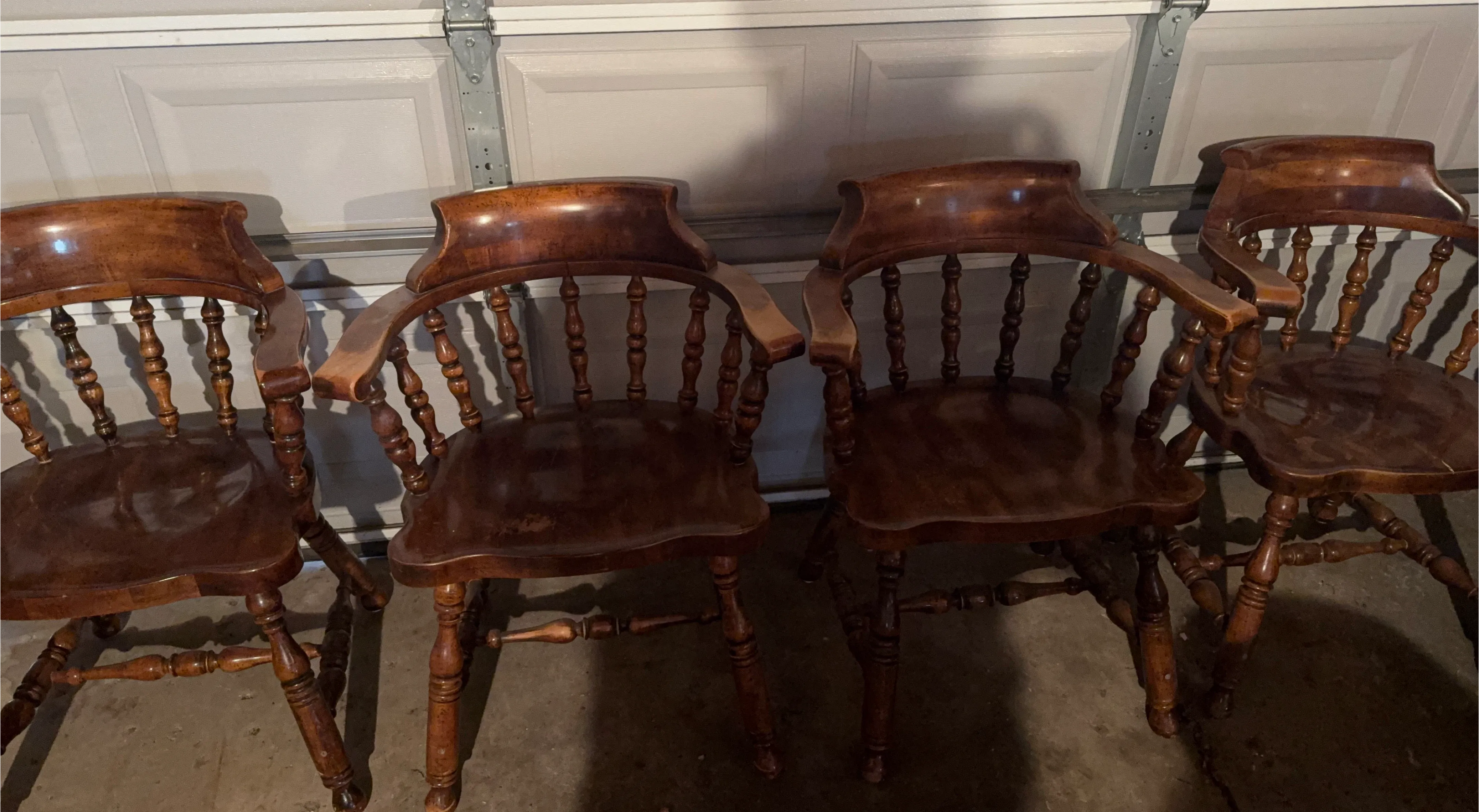 Four classic wooden armchair chairs. They're made of dark brown wood with turned legs and spindles. Solid construction for dining or accent seating.