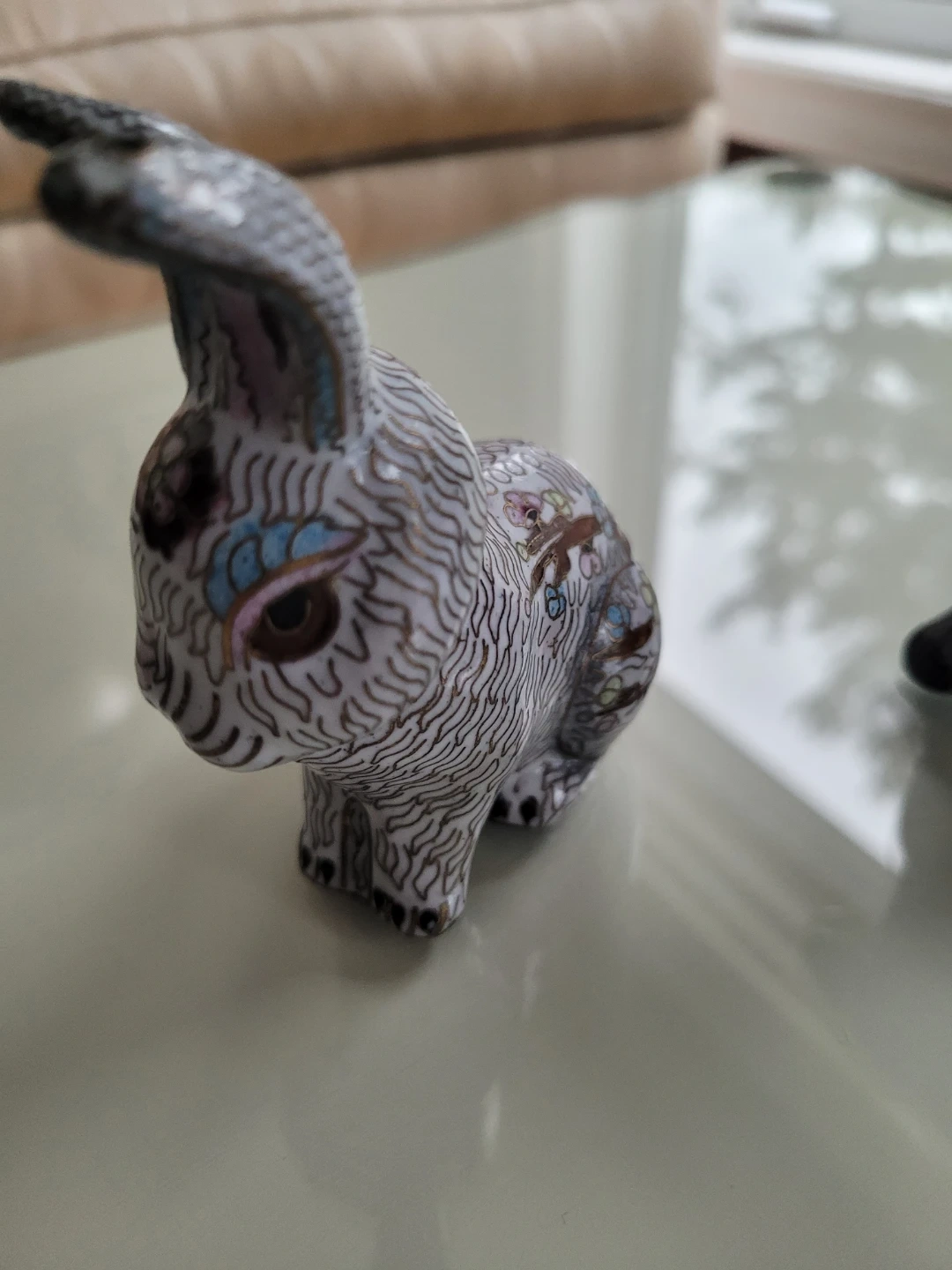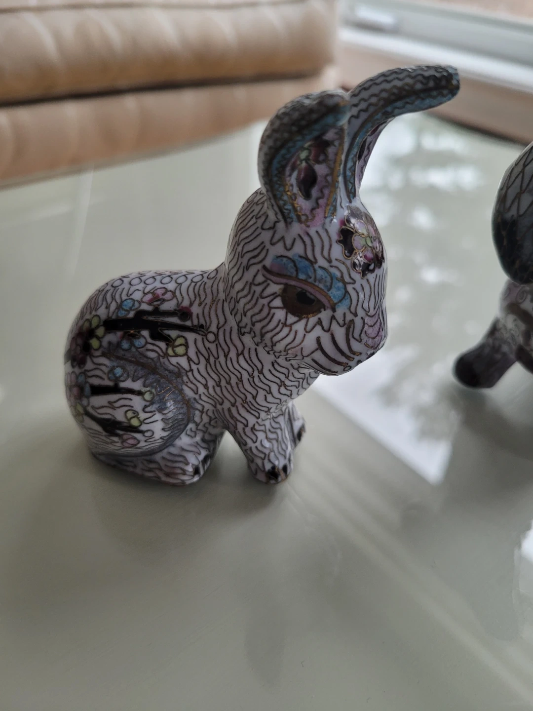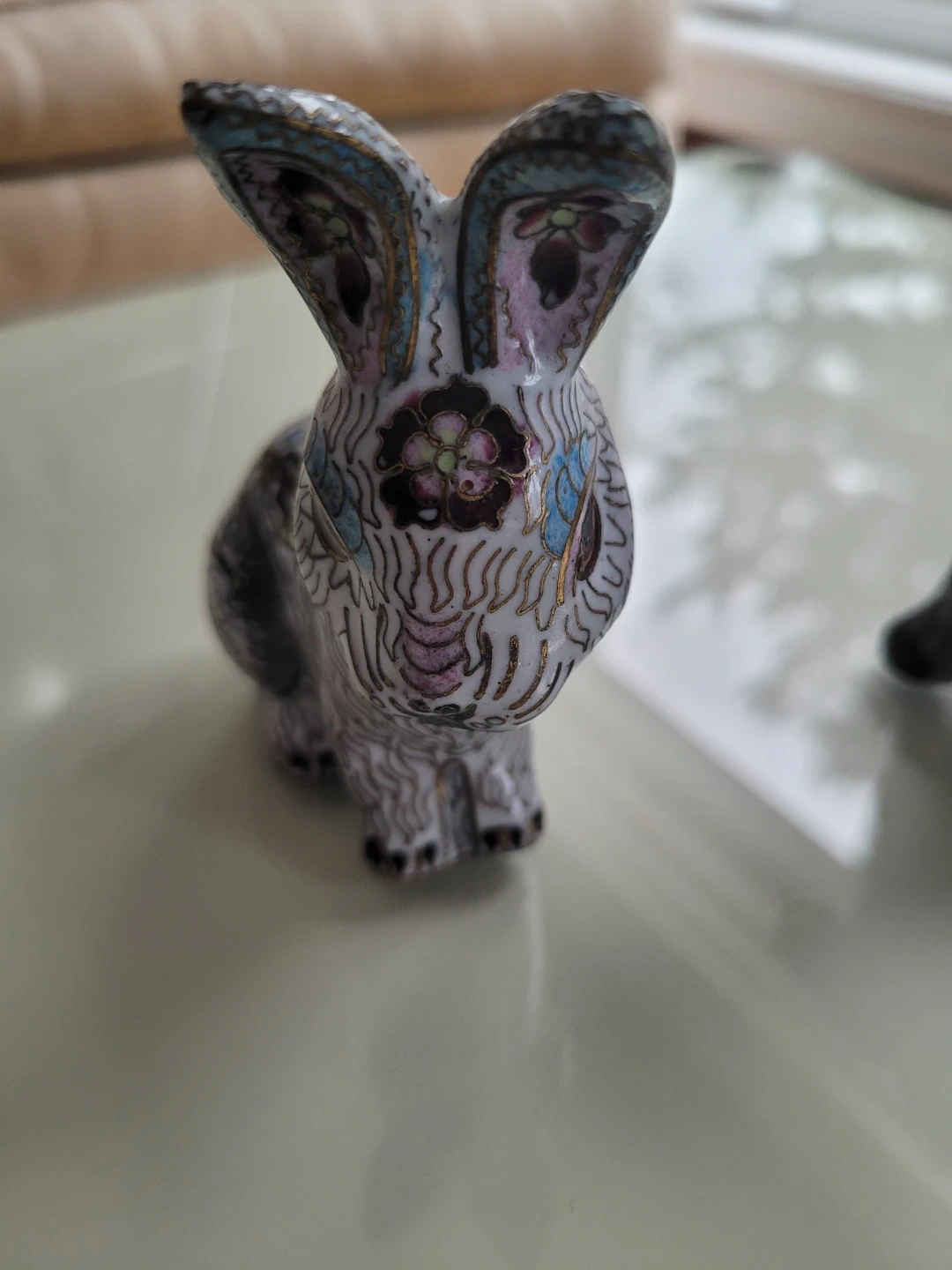 Vintage pair of decorative cloisonné figurines featuring a rabbit and a dog. Each piece displays intricate patterns and floral details. These items add a charming touch to any decor. Easter is coming, cute as a keepsake for grandchildren.