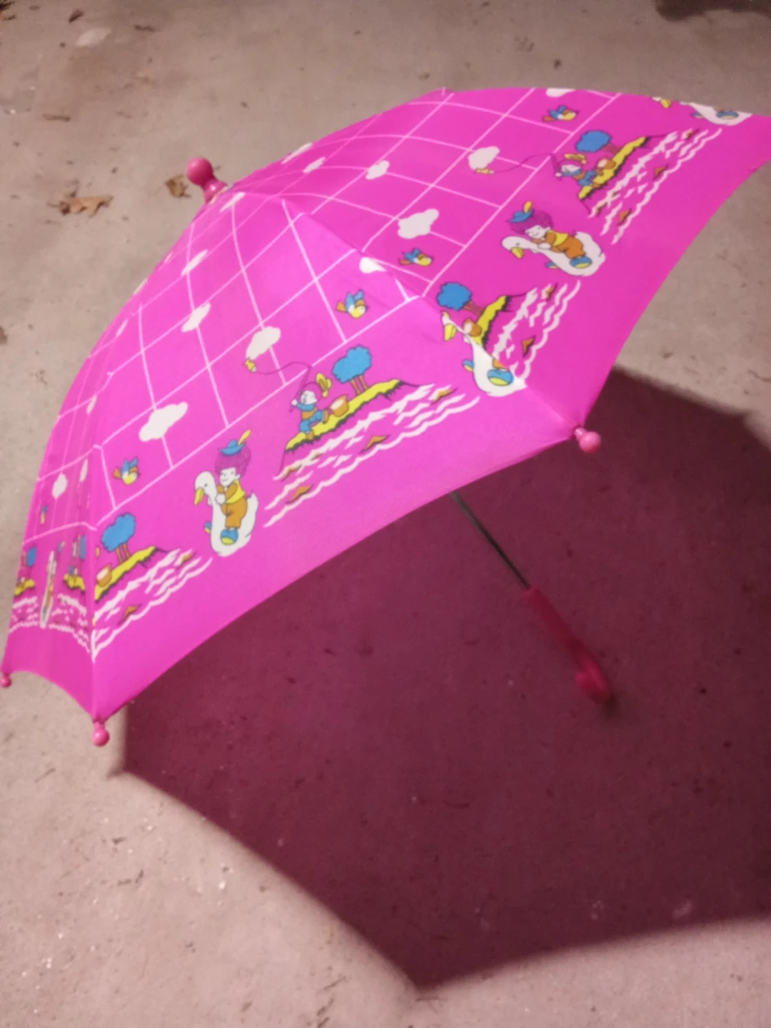This is a bright pink umbrella for kids, featuring a fun cartoon print. It's designed to keep little ones dry on rainy days. The handle and tips are also pink, matching the canopy.
