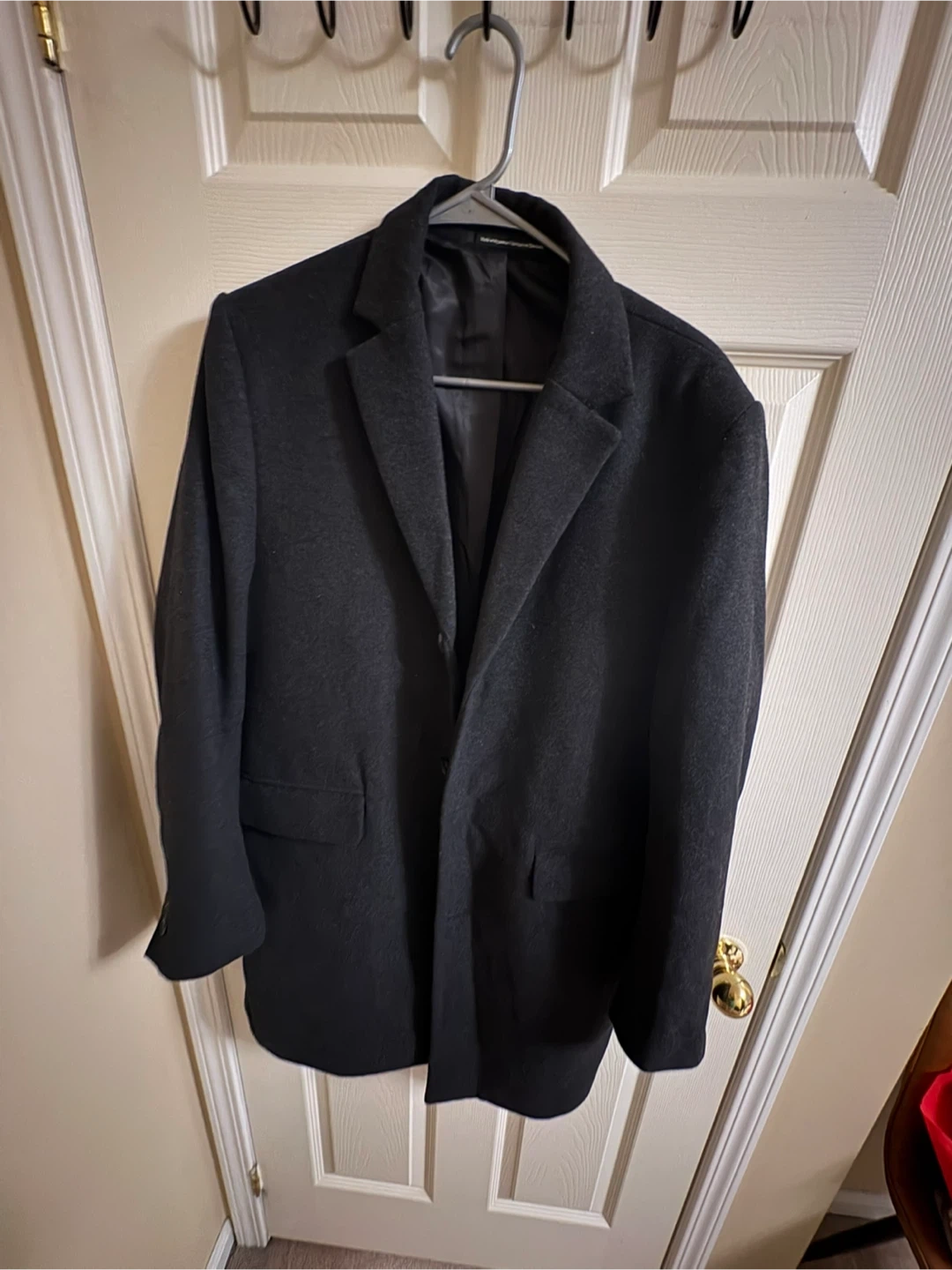 H&M Classic single-breasted overcoat in a charcoal grey wool blend. It features a notched lapel and two front flap pockets. This coat is great for layering over suits or casual wear during cooler weather.