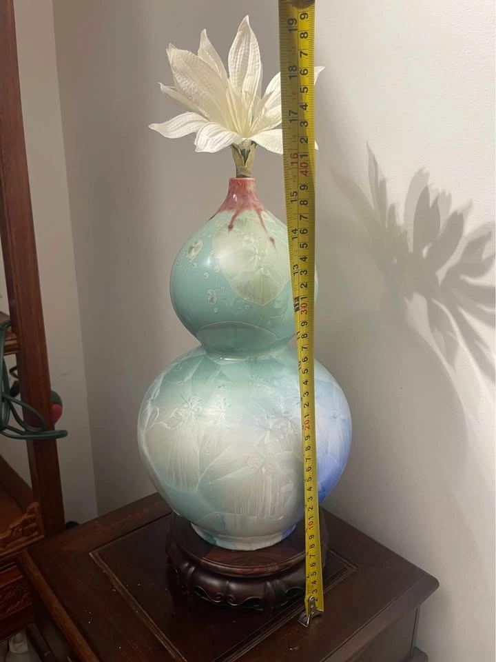 Unique two-tiered gourd vase with a beautiful crystalline glaze in shades of blue, green, and white. Features a reddish drip accent near the top. Comes with a white artificial flower. The vase is approximately 19 inches tall with the flower and about 7.5-8 inches wide at the base. Made in Jing De Zhen / China.