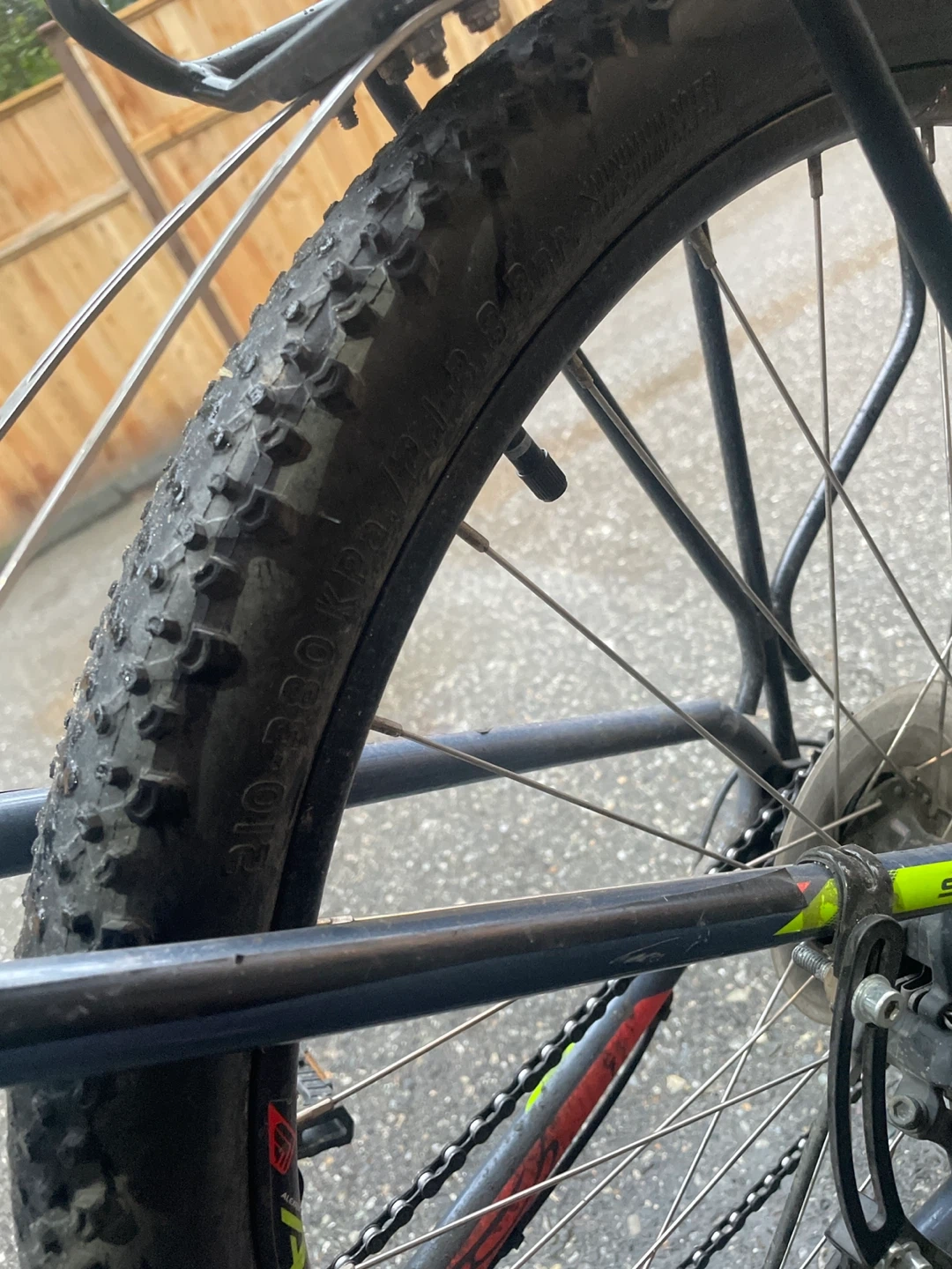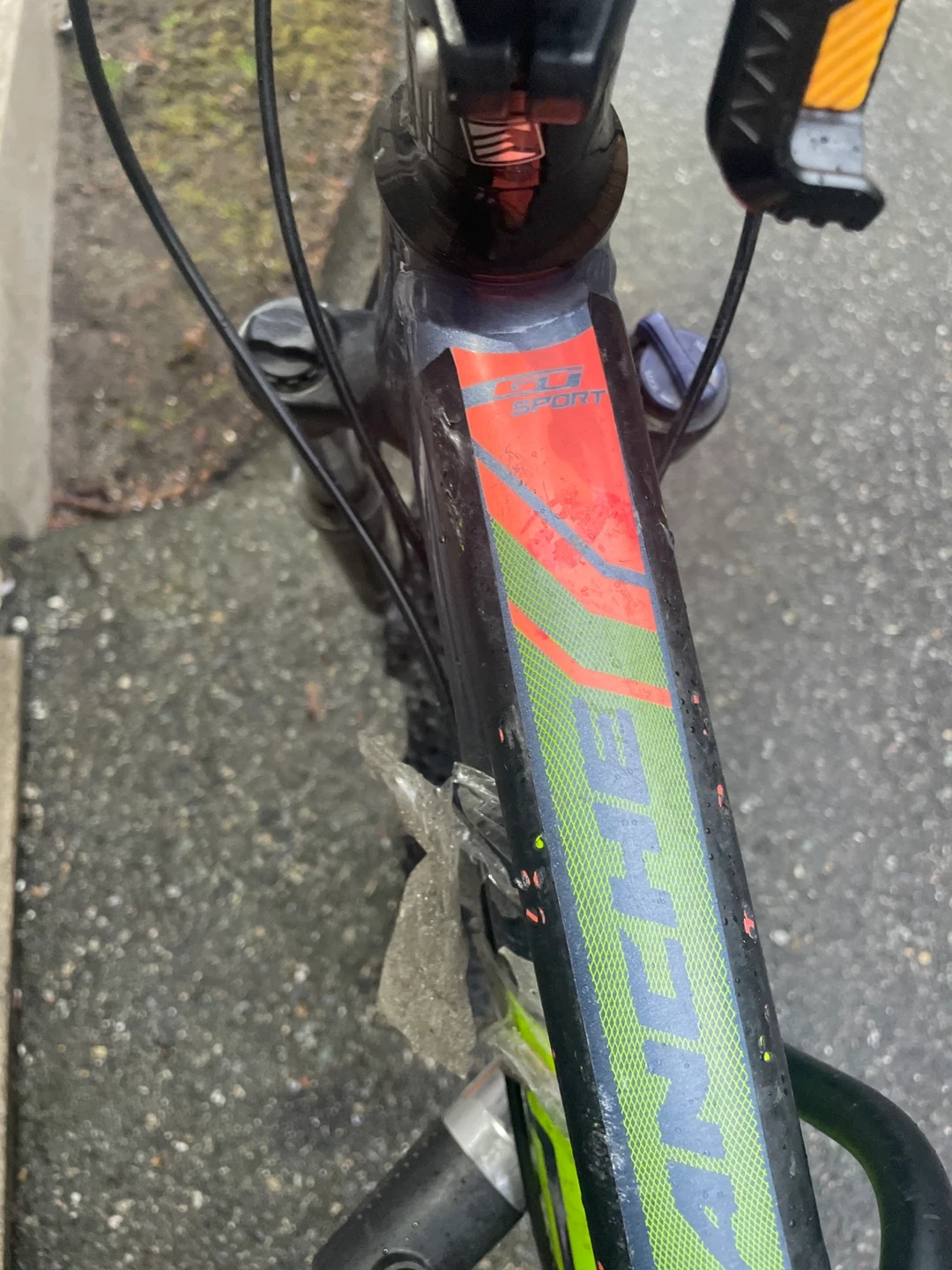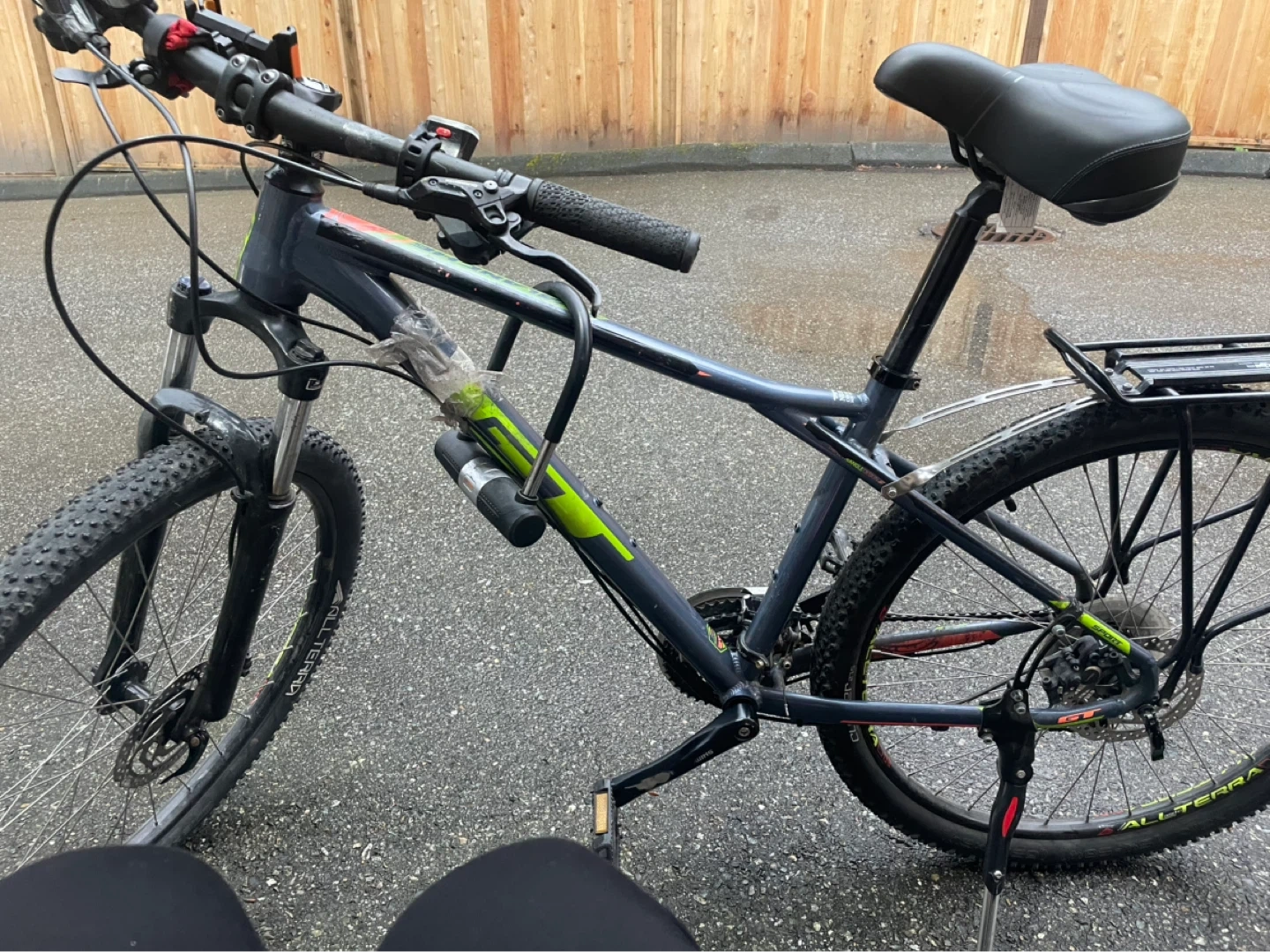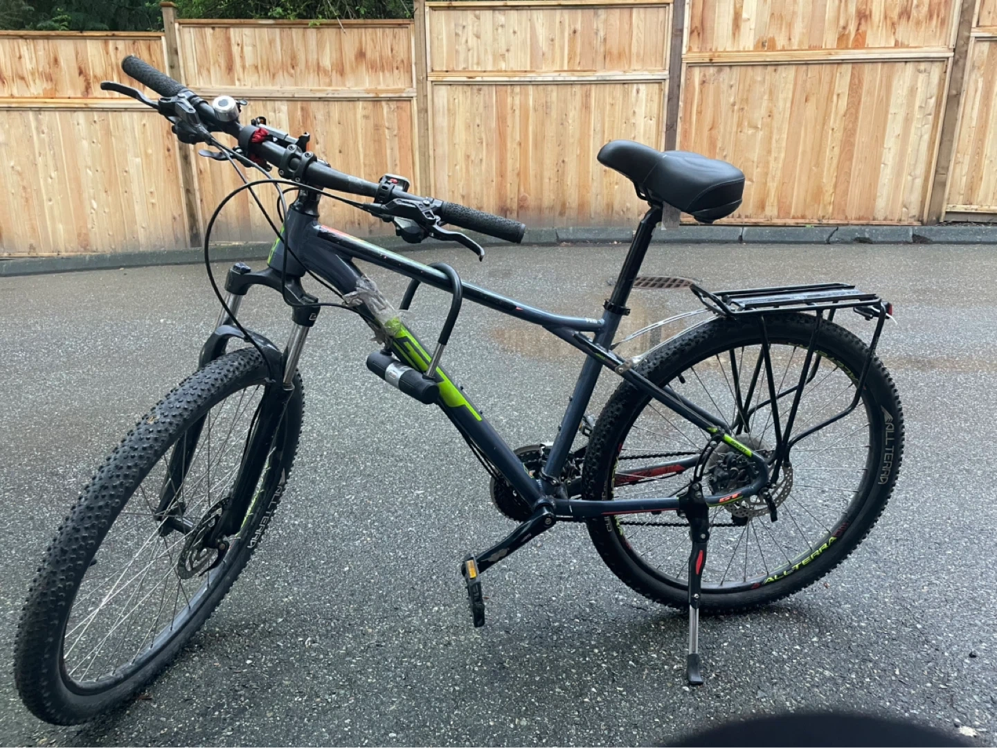 Dark grey and lime green GT Avalanche Sport mountain bike. Features front suspension and a rear rack.