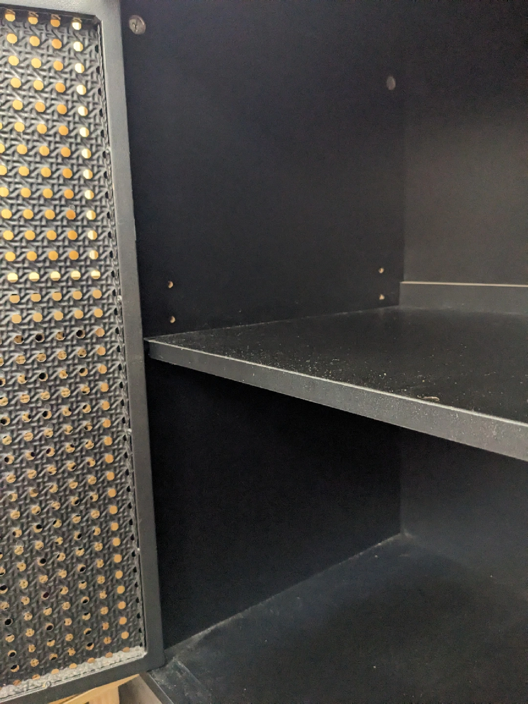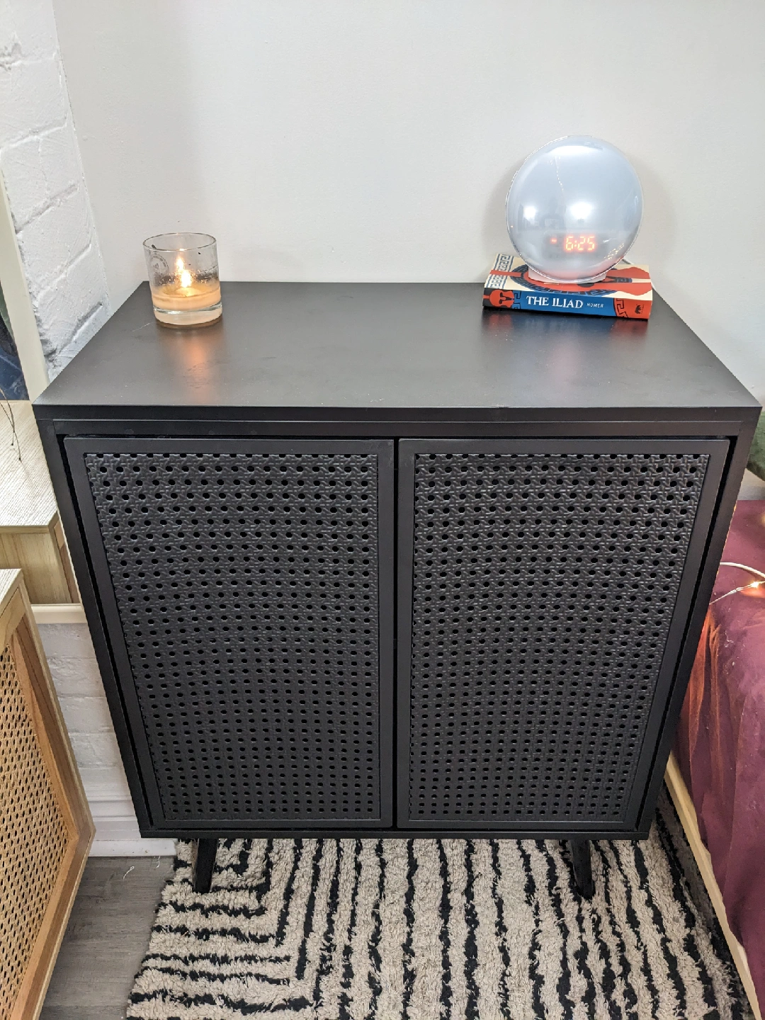 A sleek black accent cabinet with metal rattan-look magnetic/push-latch doors and attractive mcm style legs. Its shelf is slightly height-adjustable. It looks good pretty much anywhere, I just no longer have a space for it after moving.