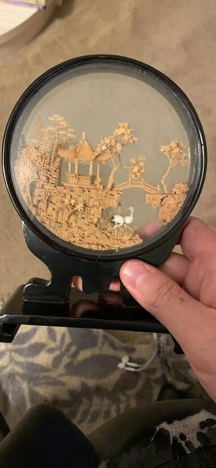 Selling a vintage Chinese cork carving shadow box. It's a beautiful piece with intricate details, depicting a traditional Chinese landscape with a pagoda, trees, and a bridge. The carving is housed in a black, circular frame with a stand. It would be a lovely addition to any home decor!