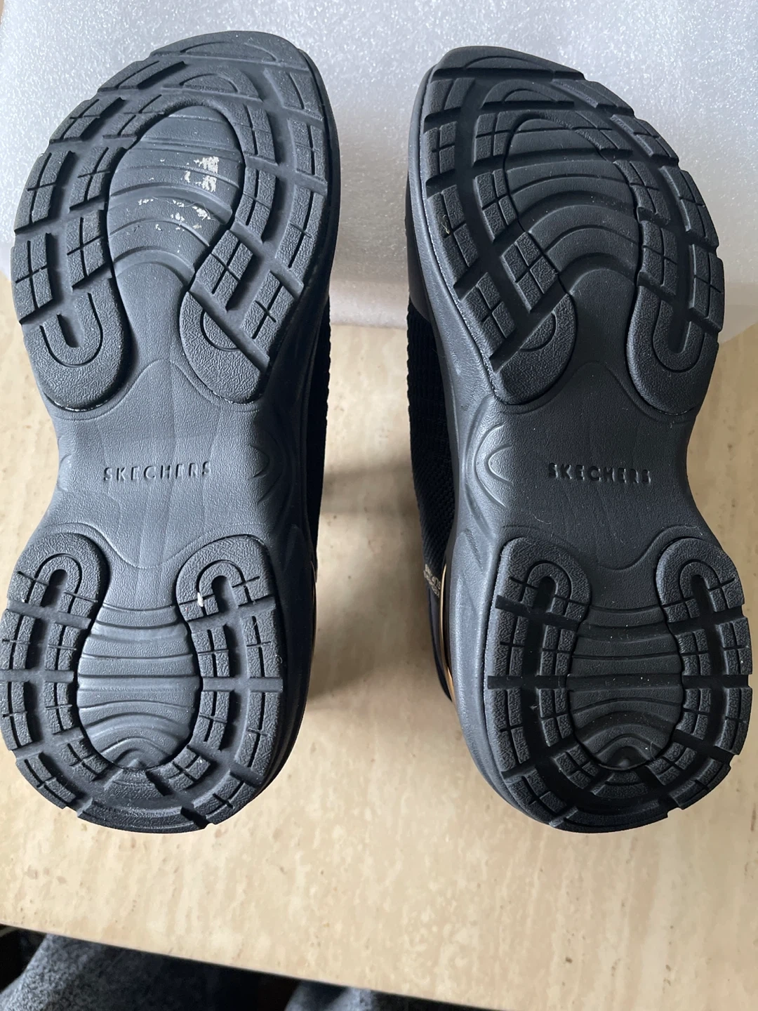 These are Skechers women's black knit slip-on sneakers. They feature a cushioned insole and a flexible knit upper for comfort. The stylish gold accent on the heel adds a nice touch.