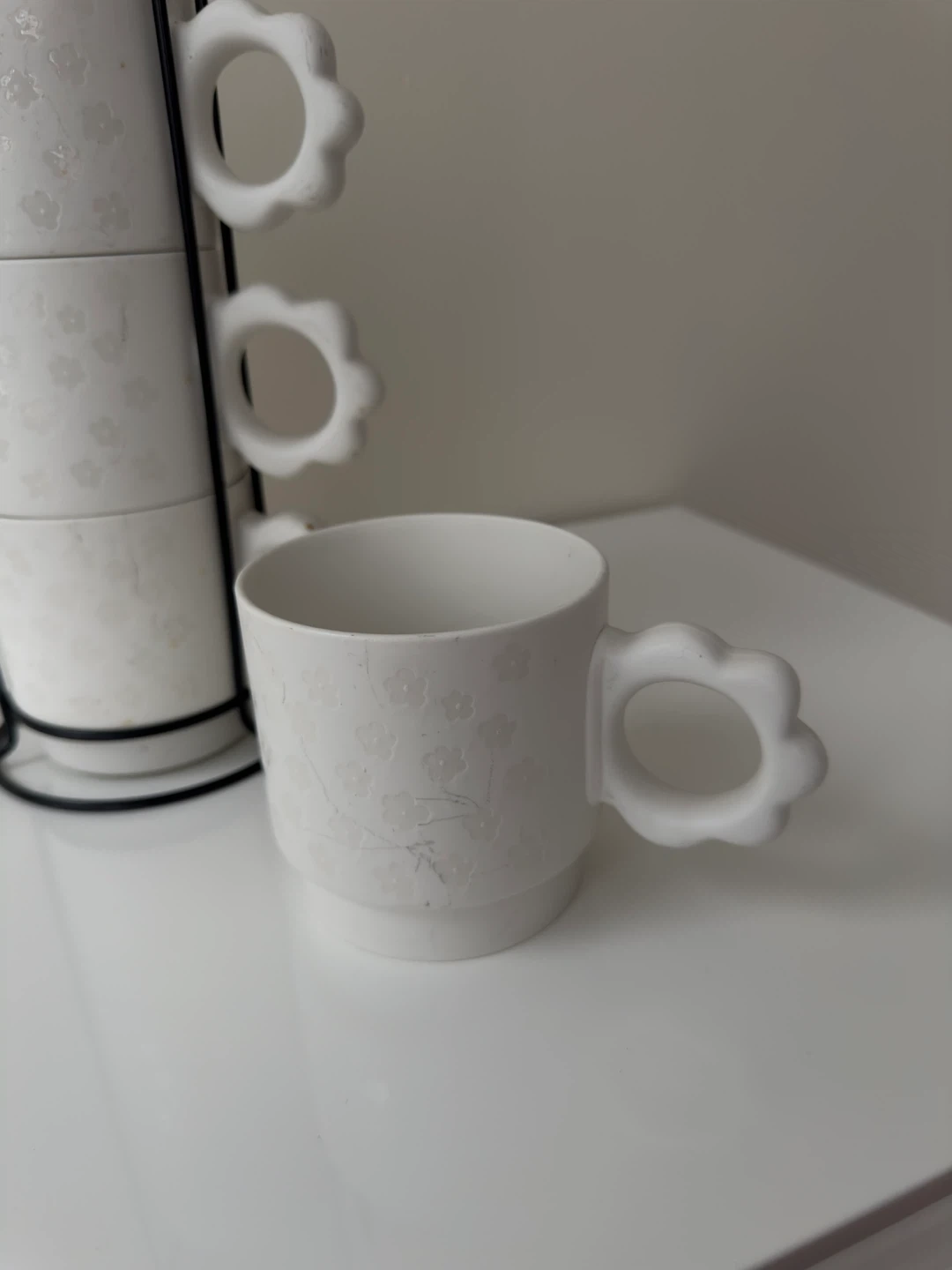 This is a set of four white ceramic mugs with a subtle floral pattern. They come with a black metal rack for storage. Only 1 cup is used and other 3 are new.