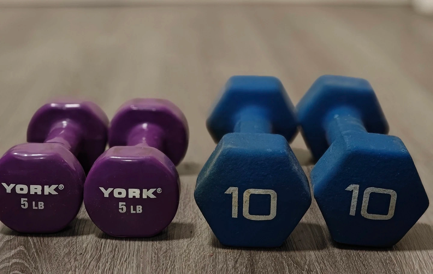 Selling a set of York dumbbells! There are two 5lb dumbbells in purple and two 10lb dumbbells in blue. They're in good condition and ready for a new workout routine