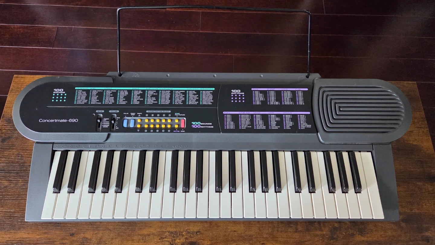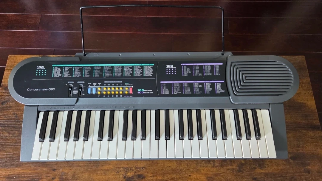 This Radioshack Concertmate 690 keyboard offers 100 rhythms and 100 sounds. It features different keyboard, wind, string, brass, and percussion instruments. This keyboard is great for learning or casual playing!